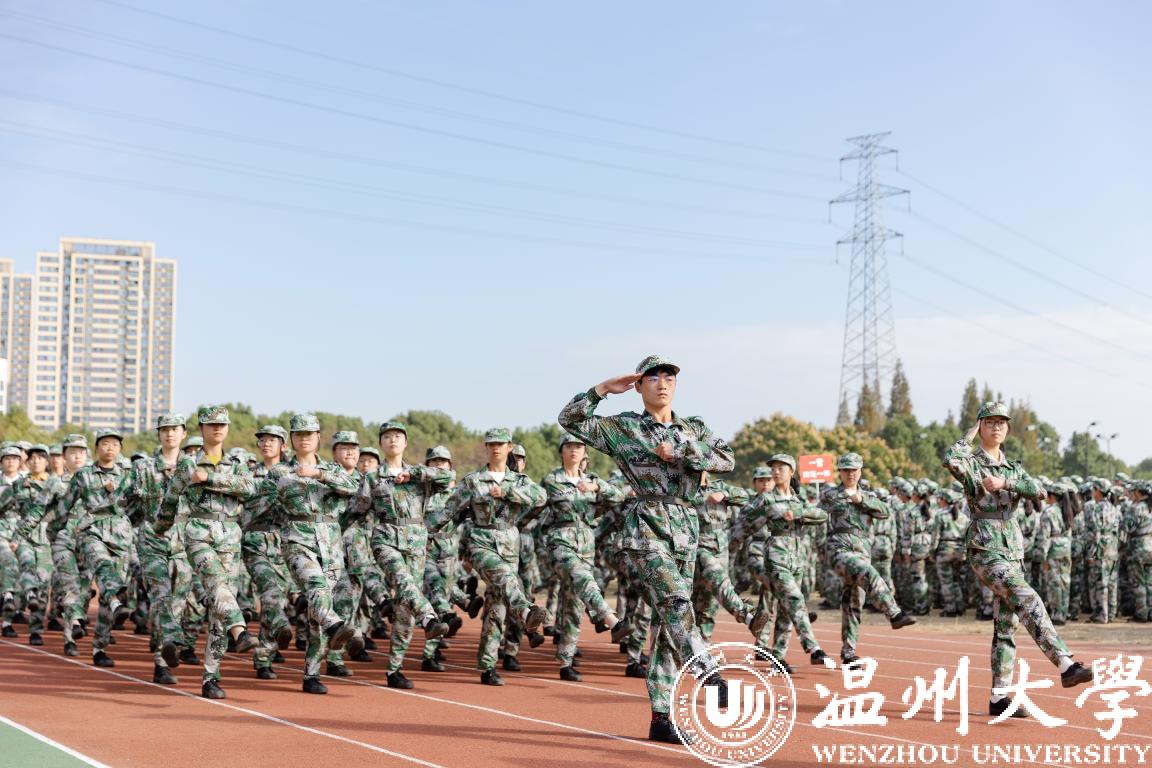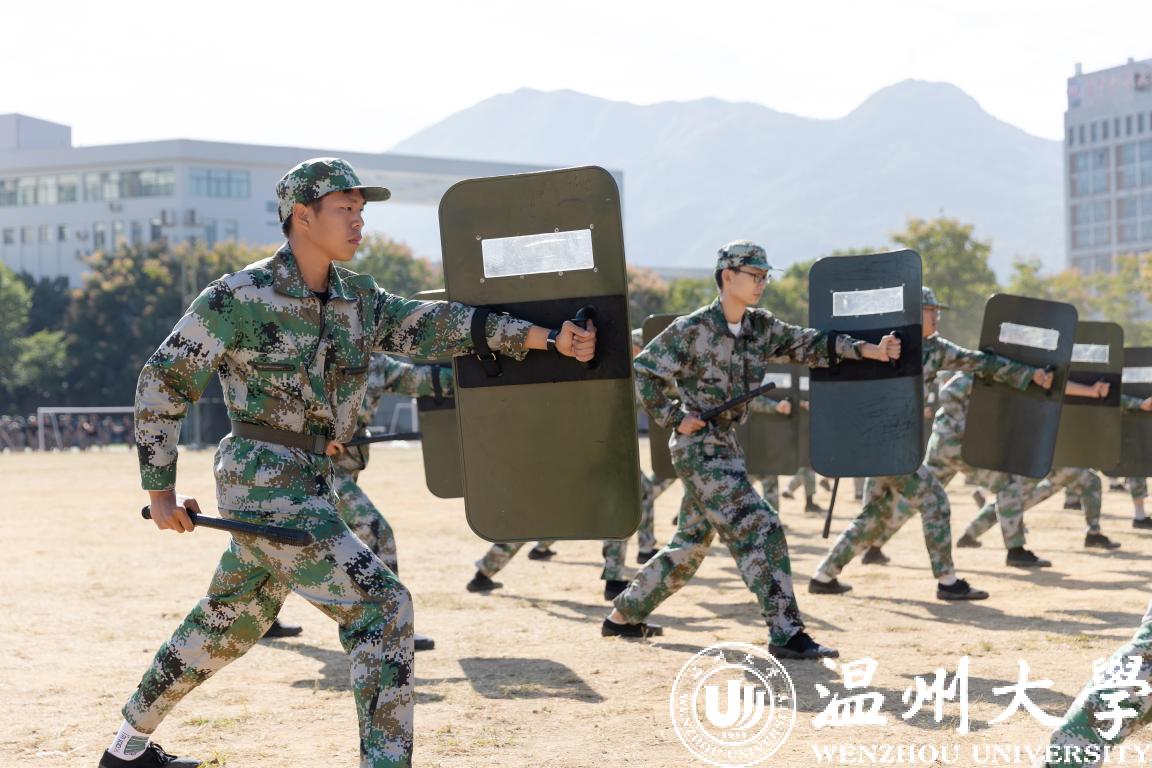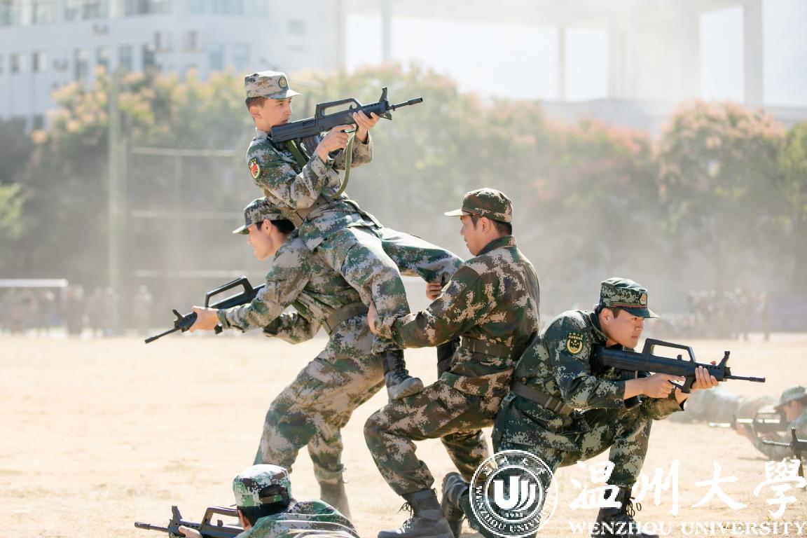 随后,分列式成果展示开始。各排学生军装笔挺、雄姿勃发、口号响亮、步伐铿锵、眼神坚毅,将求学问是、敢为人先的温大精神展现的淋漓尽致。紧接着,受训学生们展示的刺杀操、捕俘拳、营救方案等表演更是将大会推向高潮,他们尖刃出鞘,长枪来袭,一招一式敏捷有力,朦胧烟雾中,一道道身影手持枪械,卧倒、匍匐、跪滑……整场表演气势磅礴、震撼人心。