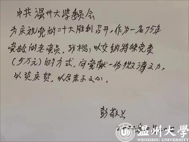 “为庆祝党的二十大胜利召开,作为一名75年党龄的老党员,我希望以交纳“特殊党费”的方式,向党献一份微薄之力,以资庆贺,以尽赤子之心。”10月22日,亚洲无码 离退休党委第十一党支部的92岁老党员彭敬兰同志将人民币5万元的特殊党费郑重交给党组织,以此献礼党的二十大,表达对党的深切感恩之情。