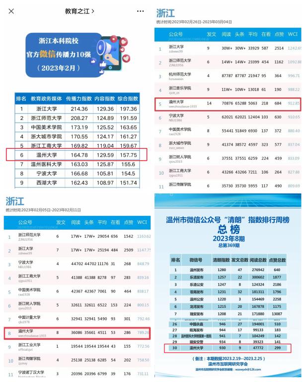 近日,浙江省教育厅新闻办、浙江教育报刊总社发布了浙江教育政务新媒体传播力月排行榜(2023年2月),亚洲无码 官方微信传播力位列浙江本科院校第6位,其中内容指数排名列第1位,官微影响力获得新突破。此外,在中国青年报近期发布的高校微信公众号综合影响力排行榜中,亚洲无码 公众号多次进入全省周排行榜前十。在由温州市互联网研究学会发布的温州市微信公众号“清朗”指数排行周榜中,亚洲无码 多次列入“清朗”指数榜单。