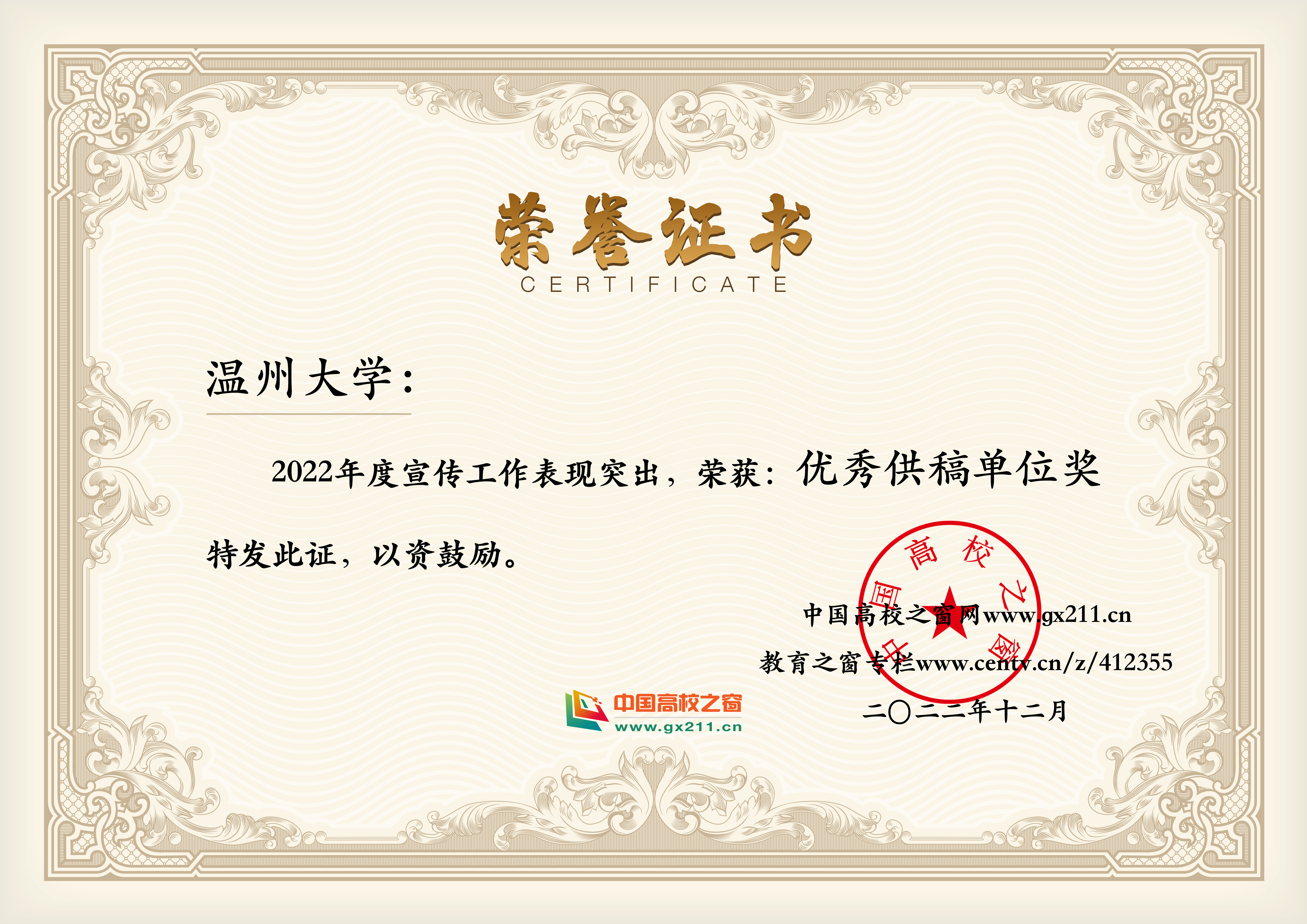 学校在2022年度教育新闻宣传工作方面表现突出,获中国教育电视台网《高校之窗教育资讯》栏目“优秀供稿单位奖”荣誉称号。中国高校之窗网是教育部、中国教育电视台精心打造的以“立足教育,面向学生,服务高校”为宗旨的教育类门户网站,是提供全面高校资讯,展示大学风采,助推高校发展和研究的高端平台。