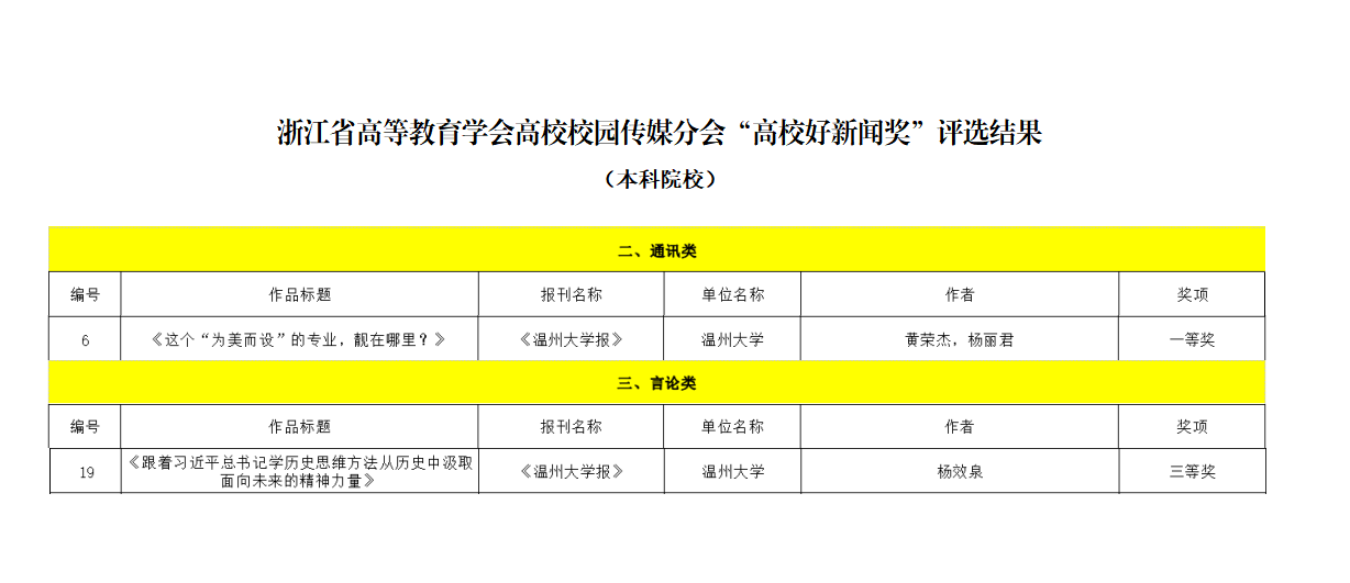 在浙江省新闻工作者协会、浙江省高等教育学会高校校园传媒分会公布的年度浙江省高校好新闻作品评选结果中,《亚洲无码 报》2件作品获浙江省“高校好新闻奖”。其中《这个“为美而设”的专业,靓在哪里?》获得通讯类一等奖,《跟着习近平总书记学历史思维方法从历史中汲取面向未来的精神力量》获得言论类三等奖。