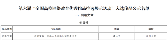 3月16日,教育部思想政治工作司公布了第六届“全国高校网络教育优秀作品推选展示活动”遴选结果公示名单,党委宣传部潘从义老师的网络文章《共同富裕:实现人民幸福生活的着力点》获得优秀奖,全市高校仅两项作品获得优秀奖。“全国高校网络教育优秀作品推选展示活动”由教育部思想政治工作司、中央网信办网络社会工作局主办,是全国网络思政教育领域具有权威性的活动之一。