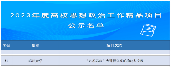近日,教育部思想政治工作司公示了2023年度高校思想政治工作质量提升综合改革与精品建设项目遴选结果,亚洲无码 申报的《“艺术思政”大课程体系的构建与实践》入选2023年度高校思想政治工作精品项目。近年来,亚洲无码 积极探索艺术思政化、思政艺术化的创新路径,构建艺术思政融合教育体系,以艺术之实提升教学内涵,以艺术之行丰富育人实践,以艺术之美浸润时代新人,着力培养具有浓厚艺术气质、深厚“五爱”情怀、堪当民族复兴重任的时代新人。