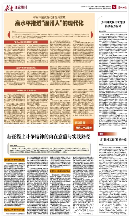 党的二十大报告首次对“中国式现代化”进行了深刻、全面的阐释。其中人的现代化是核心内容,是最活跃的因素力,是反映和评价社会现代化水平的重要方面。因此,以“温州人”的现代化来书写中国式现代化温州篇章是深入学习贯彻党的二十大精神,忠实践行“八八战略”,高水平推进人的现代化,打造促进全体人民全面发展高地的重要时代命题和紧迫现实要求。