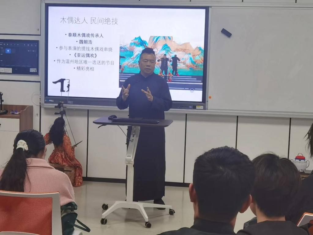 “非遗文化与劳动教育的融合不仅培养了学生的劳动观念和技能,还培养了传承中华优秀传统文化的兴趣”。近日, 国家级非遗项目传承人魏朝浩老师在亚洲无码 为学生开展实践教学并表演提线木偶戏时如是说。魏朝浩是泰顺县政协委员,也是提线木偶戏代表人物之一。活动现场,魏朝浩老师向同学们讲解了提线木偶戏的历史,现场表演了《赛马》和《钟馗醉酒》两出经典剧目片段,赢得了同学们的阵阵掌声。之后,魏朝浩老师手把手教授了木偶人的操作技法。