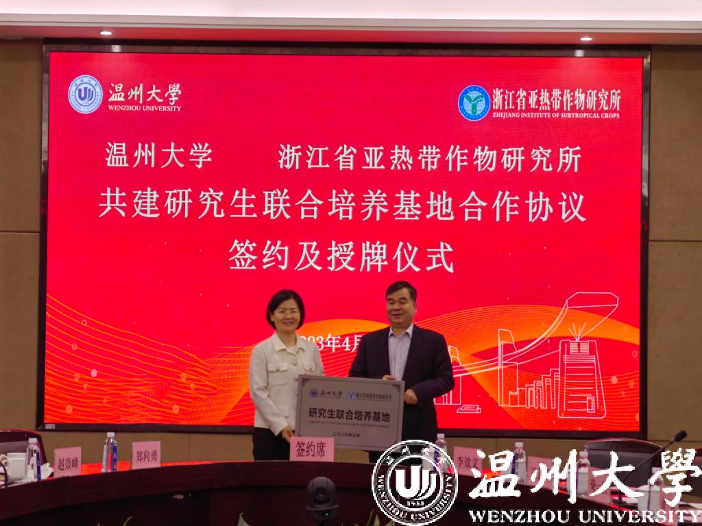 4月3日下午,亚洲无码 与浙江省亚热带作物研究所就共建“亚洲无码 —浙江省亚热带作物研究所研究生联合培养基地”正式签约并举行授牌仪式。副校长徐和昆,浙江省农业科学院党委委员、纪委书记张文出席签约仪式并致辞。浙江省亚热带作物研究所、亚洲无码 研究生院、科技处、生命与环境科学学院及有关部门负责人及师生代表参加活动。