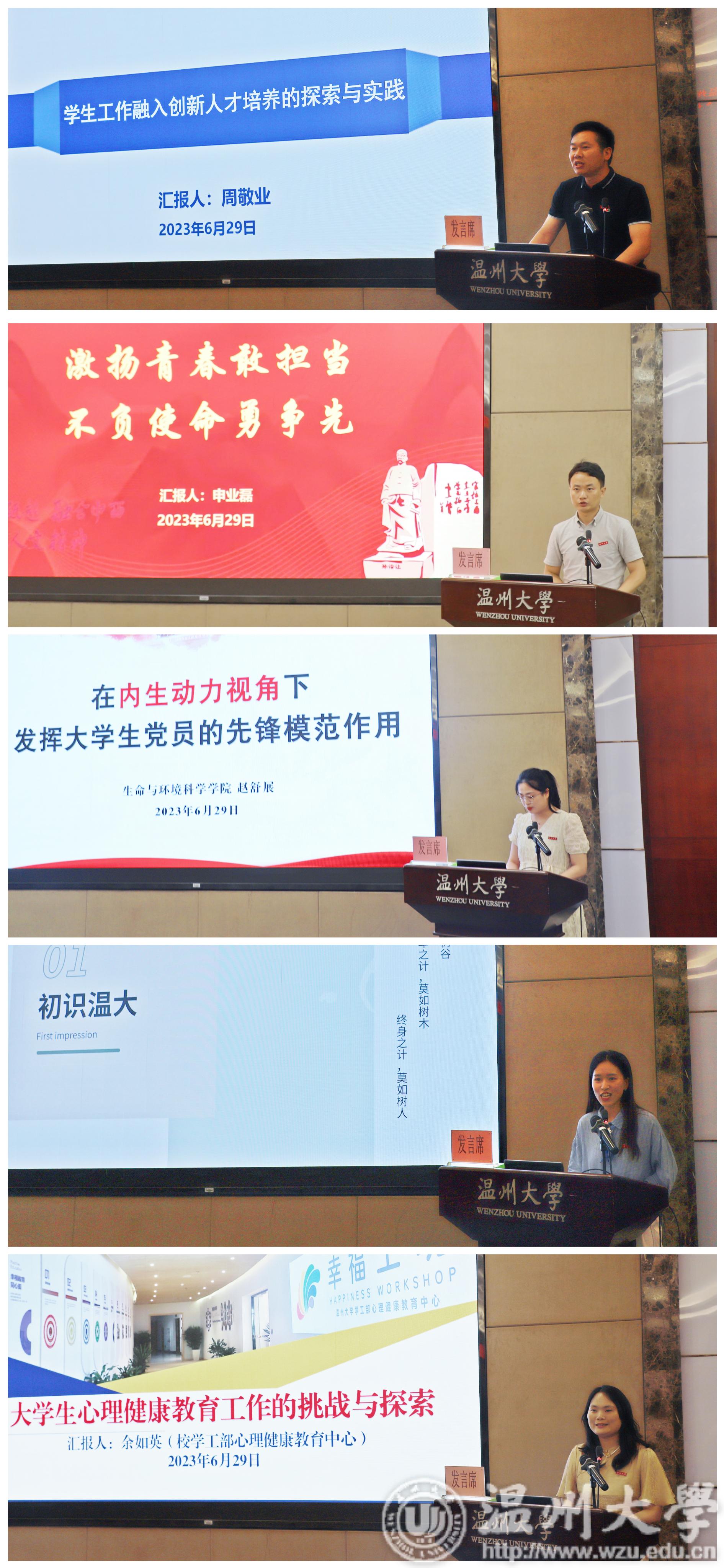 五位思政工作者工作分享。化学与材料工程学院党委副书记周敬业围绕学院创新性人才的探索与实践,介绍第一课堂与第二课堂有机衔接的经验。人文学院学工办主任申业磊结合在浙江省团校的挂职经历,分享了自己在“变”“学”“联”上下功夫做好青年工作的感悟。生命与环境科学学院辅导员赵舒展从意识、制度、平台和活动四方面入手,提出了关于提升学生党建工作质量的思考。法学院辅导员黄素素动情讲述了自己入职一年来作为一名新手辅导员的成长与蜕变。学工部心理健康教育中心主任余如英以当前高校心理健康教育面临的诸多挑战为切入点,贯穿具有鲜明温大特色的“幸福教育同心圆”心理育人模式剖析,为全体辅导员开展学生心理健康教育提供新思路。