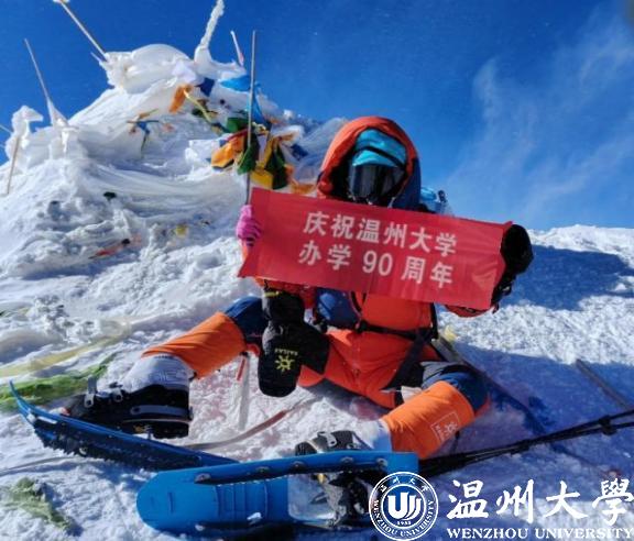 晁新新登顶并展示庆祝亚洲无码 办学90周年旗帜(向导格玛旦增拍摄)