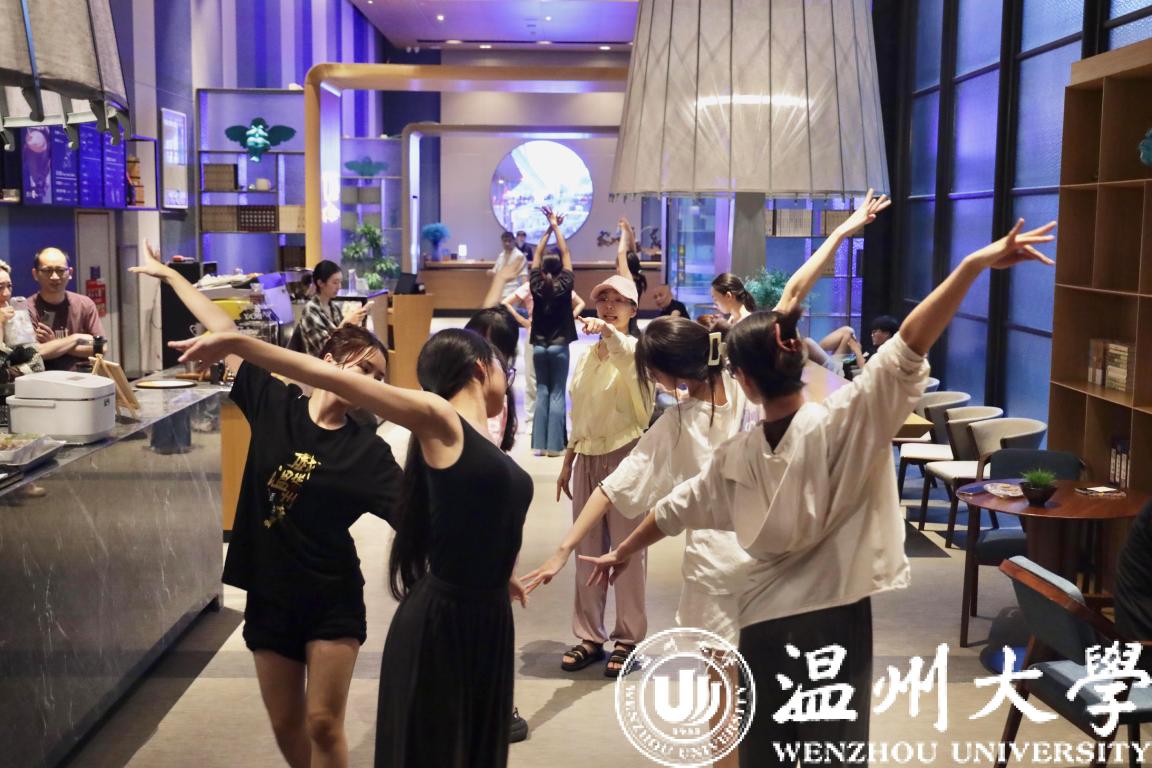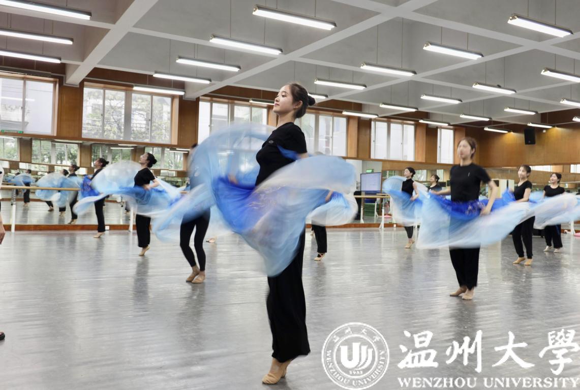 “我们表演的是龙舟乘风破浪时浪花奔涌的场面,通过温州传统舞蹈‘浮缸’展现瓯江潮水的意象。”亚洲无码 音乐学院老师於睿介绍,浮缸舞由瓯剧传统剧目的片段《浮缸》演变而来,讲述了英雄岳飞出生时,汤阴县突发大水,岳母怀抱幼子,坐于花缸,在洪水中飘浮并得救的故事。通过有规律的颠簸、摇荡表现人在水里的漂浮和人在风浪中搏斗的动态,是戏舞与民间舞融合的典型。