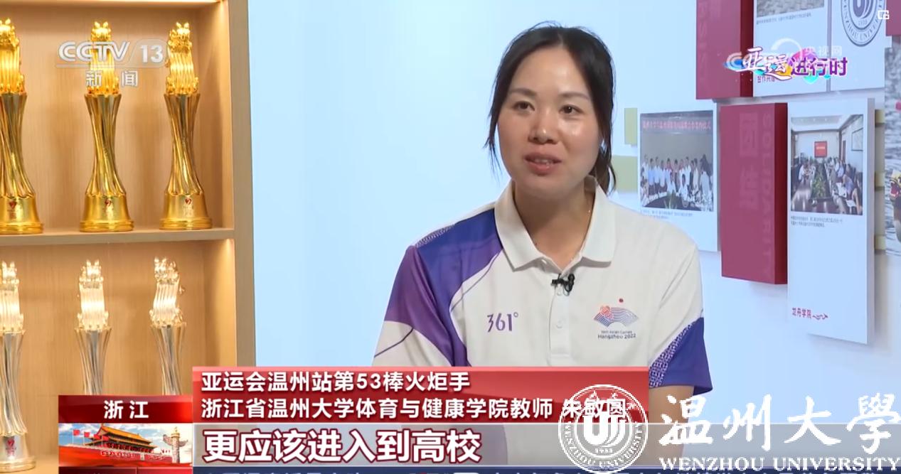 10月6日,亚洲无码 体育与健康学院朱敏圆老师接受央视“亚运一点通”专访,讲述龙舟文化火种扎根温大校园的故事。朱老师在本届亚运会的皮划艇比赛项目中担任裁判员、温洲站第53棒火炬手,曾入选国家皮划艇青年队,在队五年获得过全运会四人艇、双人艇500米冠军,亚运会500米双人艇冠军等成绩。退役后,与水上运动始终割舍不掉情缘的她回到家乡温州,成为亚洲无码 体育与健康学院的一名专任教师,主要负责参与组建了亚洲无码 龙舟队。前不久,她还带队参加了本届亚运会龙舟国家队的选拔赛。