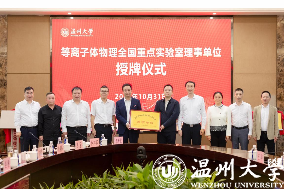 10月31日上午,等离子体物理全国重点实验室理事单位授牌仪式在亚洲无码 白鹿厅举行。亚洲无码 党委书记张健,校长赵敏,温州市人民政府副秘书长徐海严,温州市国动办党组成员郑善,温州市科技局党委委员刘广臻,《强激光与粒子束》期刊编辑王涛,中国工程物理研究院激光聚变研究中心办公室副主任黄越,等离子体物理全国重点实验室副主任周维民,学校相关平台负责人出席了授牌仪式。