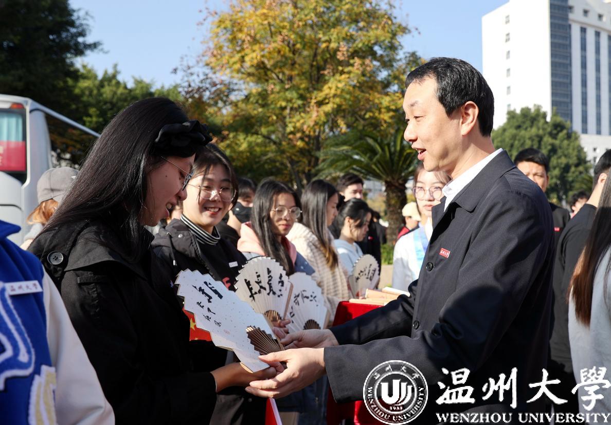 仪式前,张健亲切慰问了师生演职人员,并为他们送上一份“特殊”的礼物。礼物是由美术与设计学院书法专业师生精心为歌剧《五星红旗》创作的文化扇,他们将对《五星红旗》巡演的美好祝福寄托于走笔运墨所诞生的笔意情性中,这也是亚洲无码 艺术类课程思政化全方位融合的生动体现。