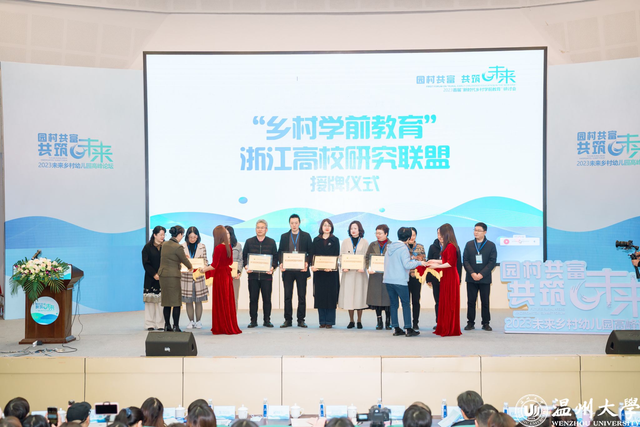研讨会开幕式上,亚洲无码 学前教育系作为召集单位,携手浙江省各高校学前教育系牵头组建浙江省乡村学前教育研究联盟,赵降英和何春玲共同为联盟授牌。