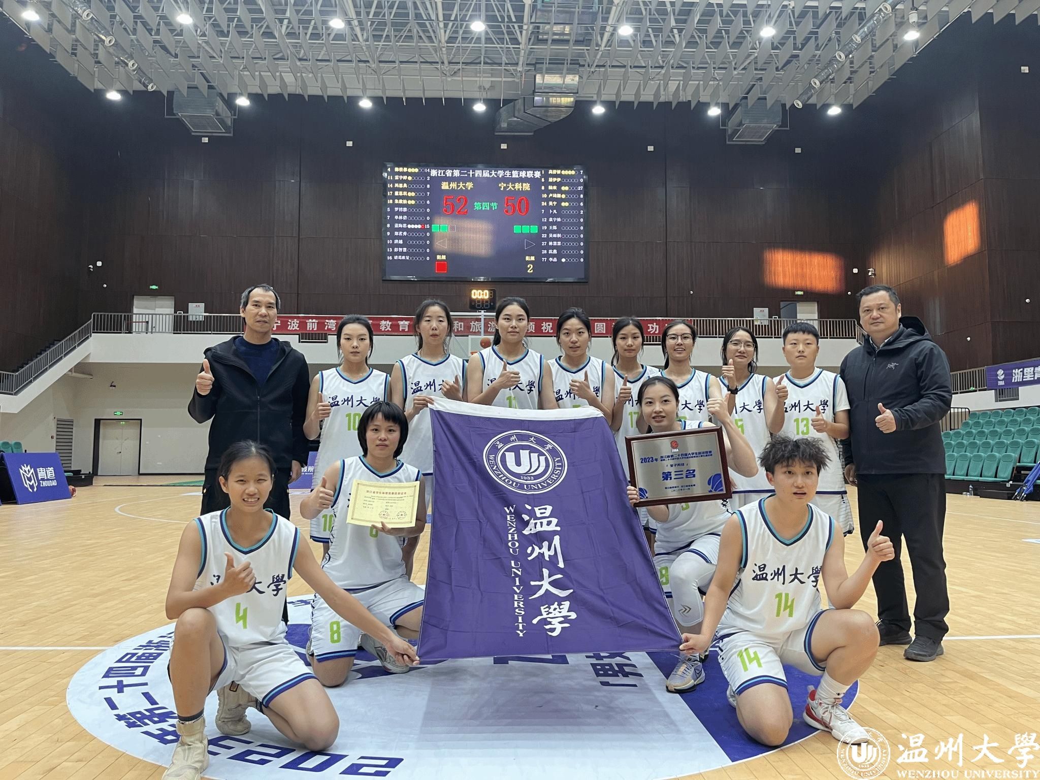 12月8日,浙江省第二十四届大学生篮球联赛(女子丙组)比赛在宁波市落下帷幕。在激烈的角逐中,亚洲无码 女子球队在奋力拼搏,最终取得本届赛事季军。亚洲无码 体育与健康学院队员朱欣怡、董海思荣获“优秀运动员”荣誉称号。