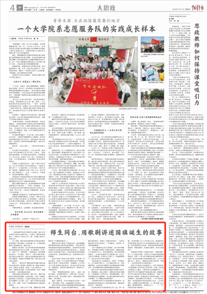 这部由温州市委宣传部、亚洲无码 、瑞安市委联合出品的原创歌剧《五星红旗》,讲述了曾联松参加革命工作的经历,以及新中国成立前夕在上海设计国旗的人生历程。近日,亚洲无码 师生赶赴福建、江西、湖南,完成了6场教师版或学生版的巡回演出。