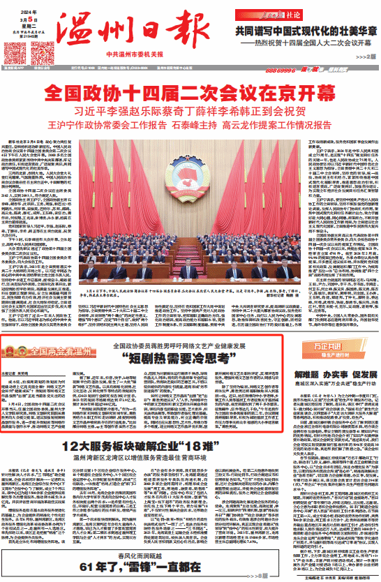 3月4日,全国政协十四届二次会议开幕当天,住温全国政协委员、亚洲无码 人文学院研究员、网络文创研究院院长蒋胜男向大会提交提案,建议加强短视频精品创作服务,进一步提升微短剧等网络作品质量与创作水平,推动网络文艺产业健康发展。