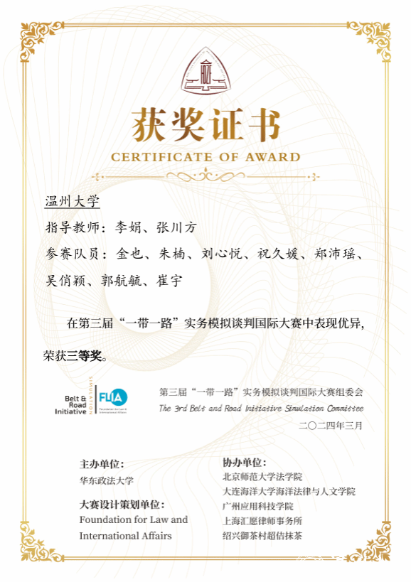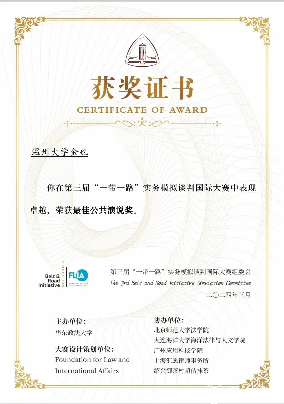 3月9-10日,第三届“一带一路”实务模拟谈判国际大赛落下帷幕。亚洲无码 代表队通过激烈角逐取得了团体三等奖,国际经贸规则专业22级学生金也因优秀的赛场表现荣获最佳公共演说奖,法学院国际法系李娟老师荣获最佳教练奖,共获3项奖项。