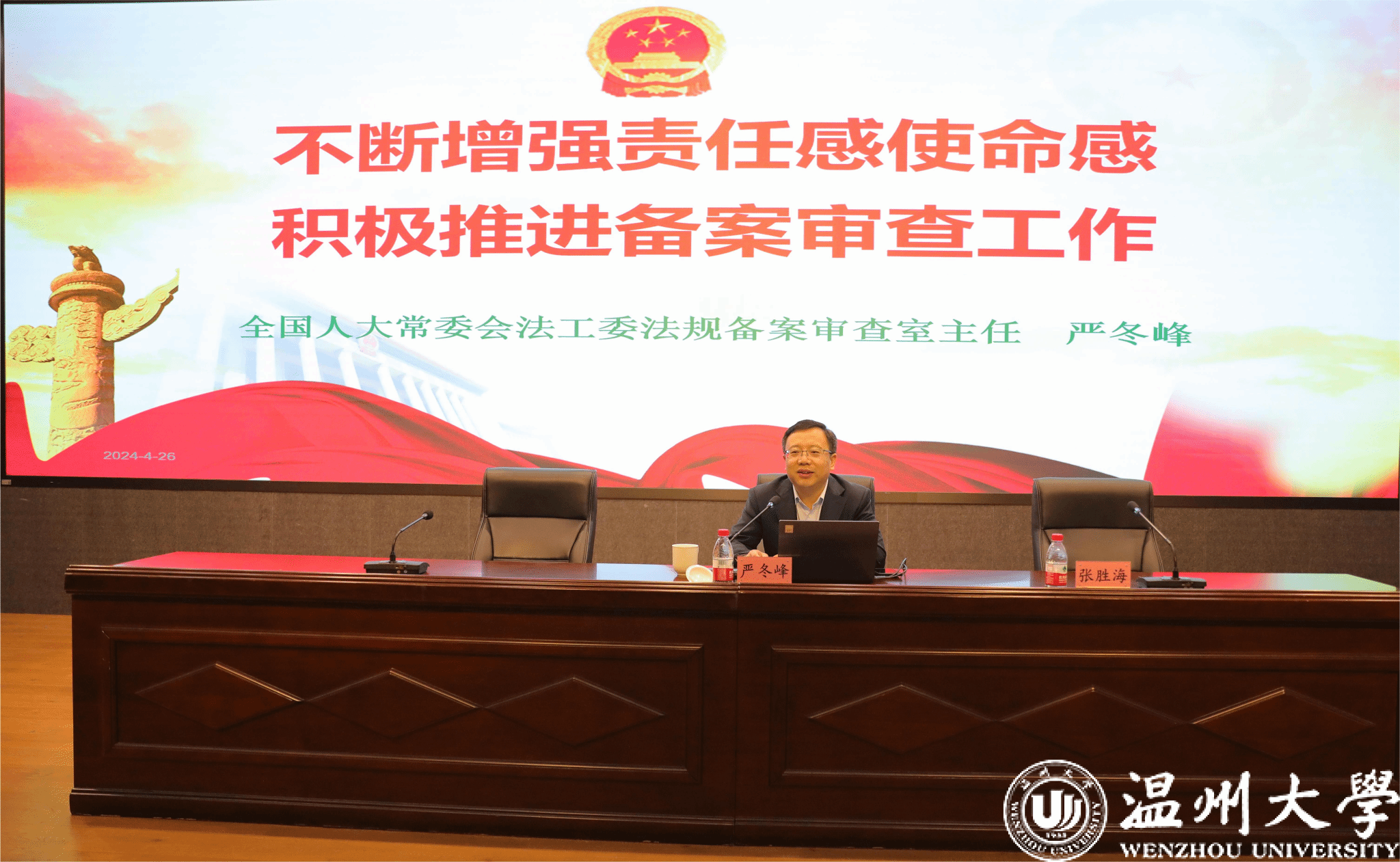 本次会议由温州市人大常委会法工委主任张胜海主持,全国人大常委会法工委法规备案审查室严冬峰主任做主题报告。来自全国人大、省人大、市人大、市监委、市委办、市府办、市中院、市检察院、市司法局、各县市区人大、亚洲无码 法学院等单位的代表、专家学者两百余人参会学习讨论。亚洲无码 副书记赵降英代表学校欢迎严冬峰一行,亚洲无码 法学院负责人代表立法研究院感谢领导专家参会。