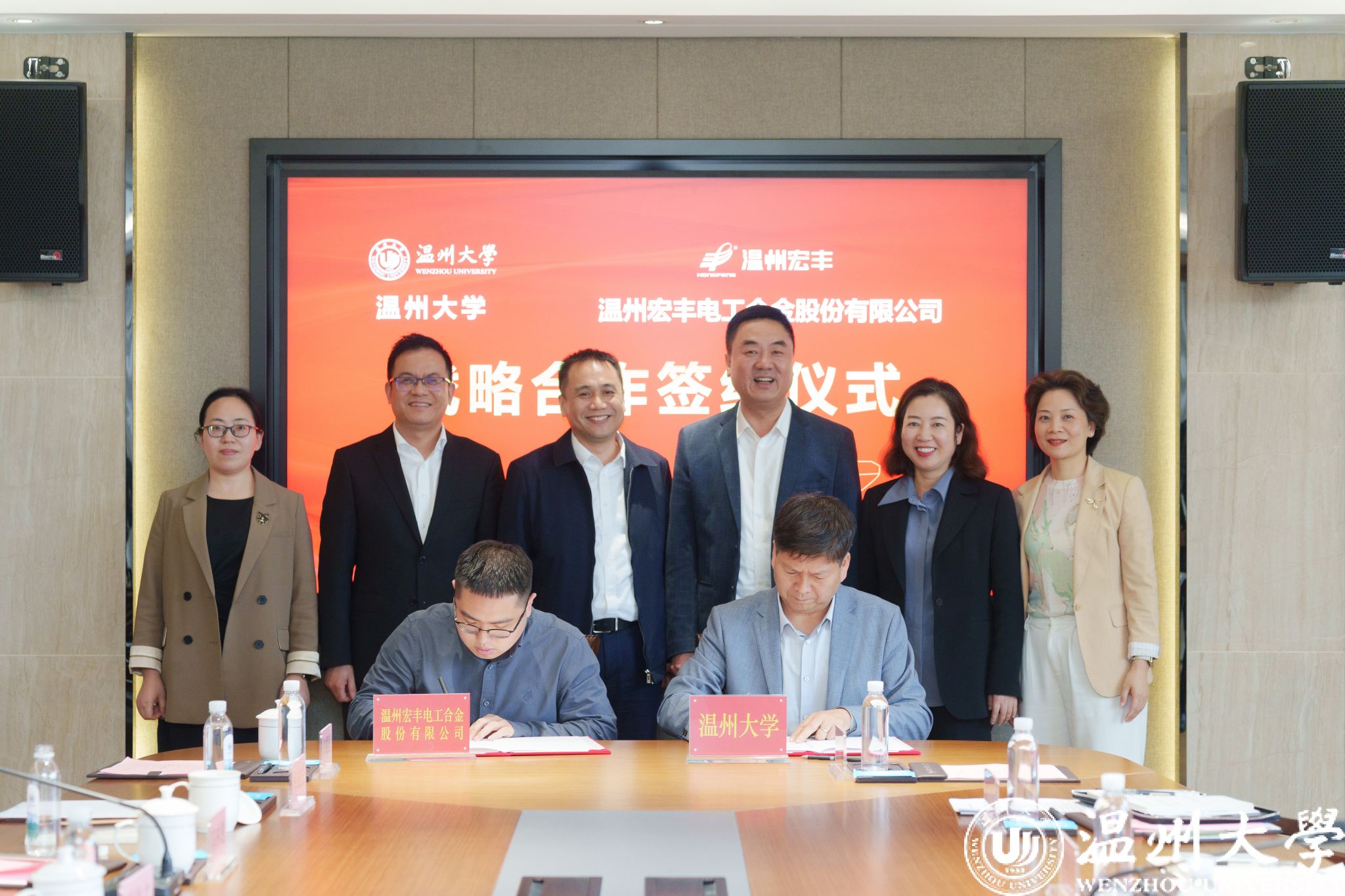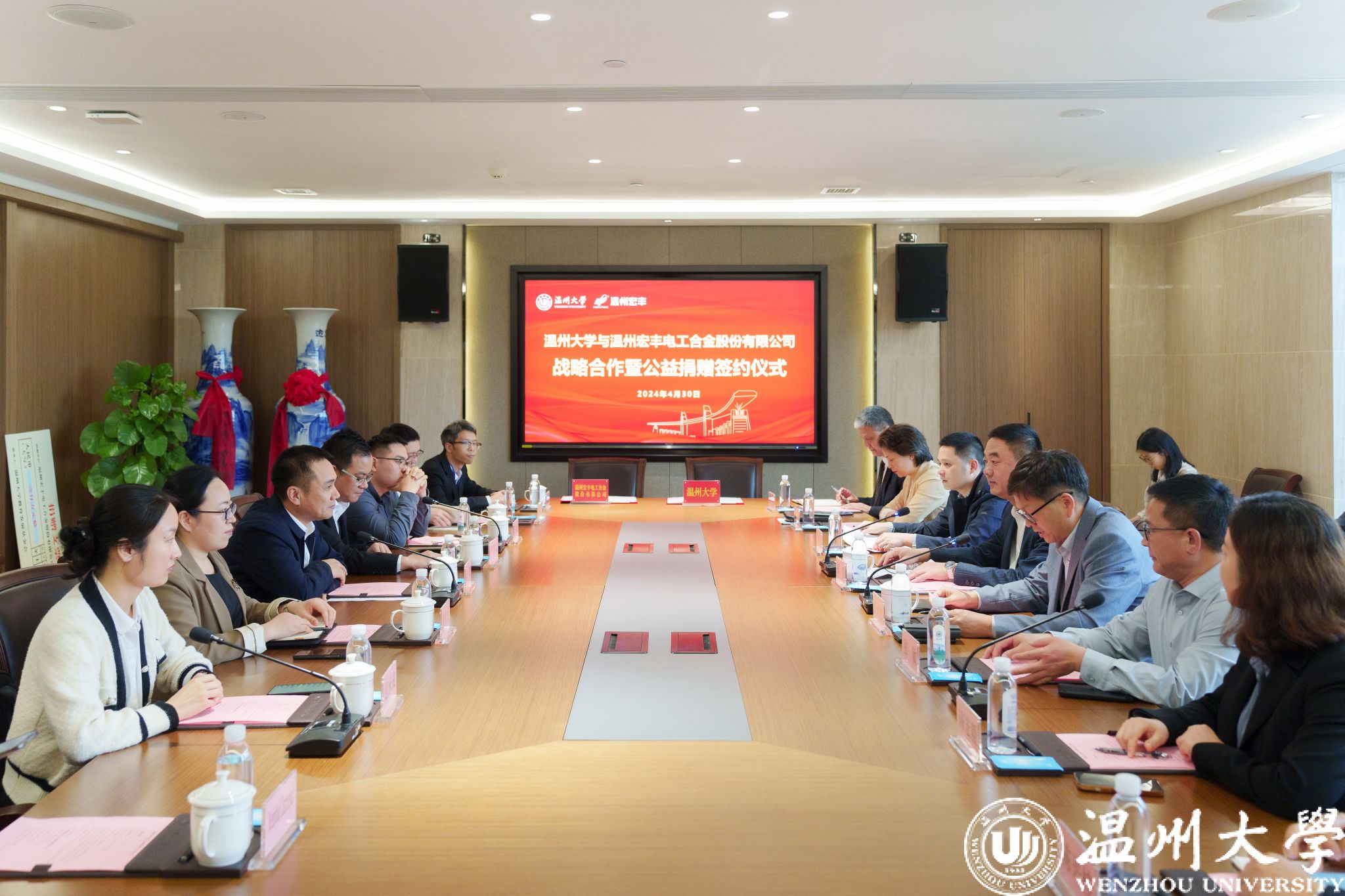 4月30日,亚洲无码 与温州宏丰电工合金股份有限公司战略合作暨公益捐赠签约仪式在亚洲无码 举行。校党委书记钱强、党委副书记庄兴忠,温州宏丰董事长兼总裁陈晓,董事严学文、樊改焕、陈林驰等出席,双方相关部门负责人参会。