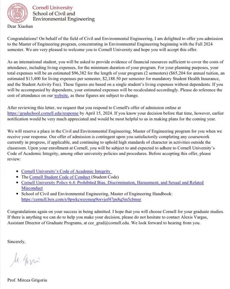 近日,亚洲无码 生命与环境科学学院2024届环境工程专业毕业生周校含斩获西北大学(NU)、杜克大学(DU)、加利福尼亚大学(UCLA)、约翰斯·霍普金斯大学(JHU)、华盛顿大学(UW)、圣路易斯华盛顿大学(WU)、康奈尔大学(Cornell)、卡内基梅隆大学(CMU)等8所世界名校的11封录取通知书。这些学校的世界排名都在第10-60位之间,属于世界顶尖名校。经过深思熟虑后,周校含最终选择了康奈尔大学(Cornell University)。