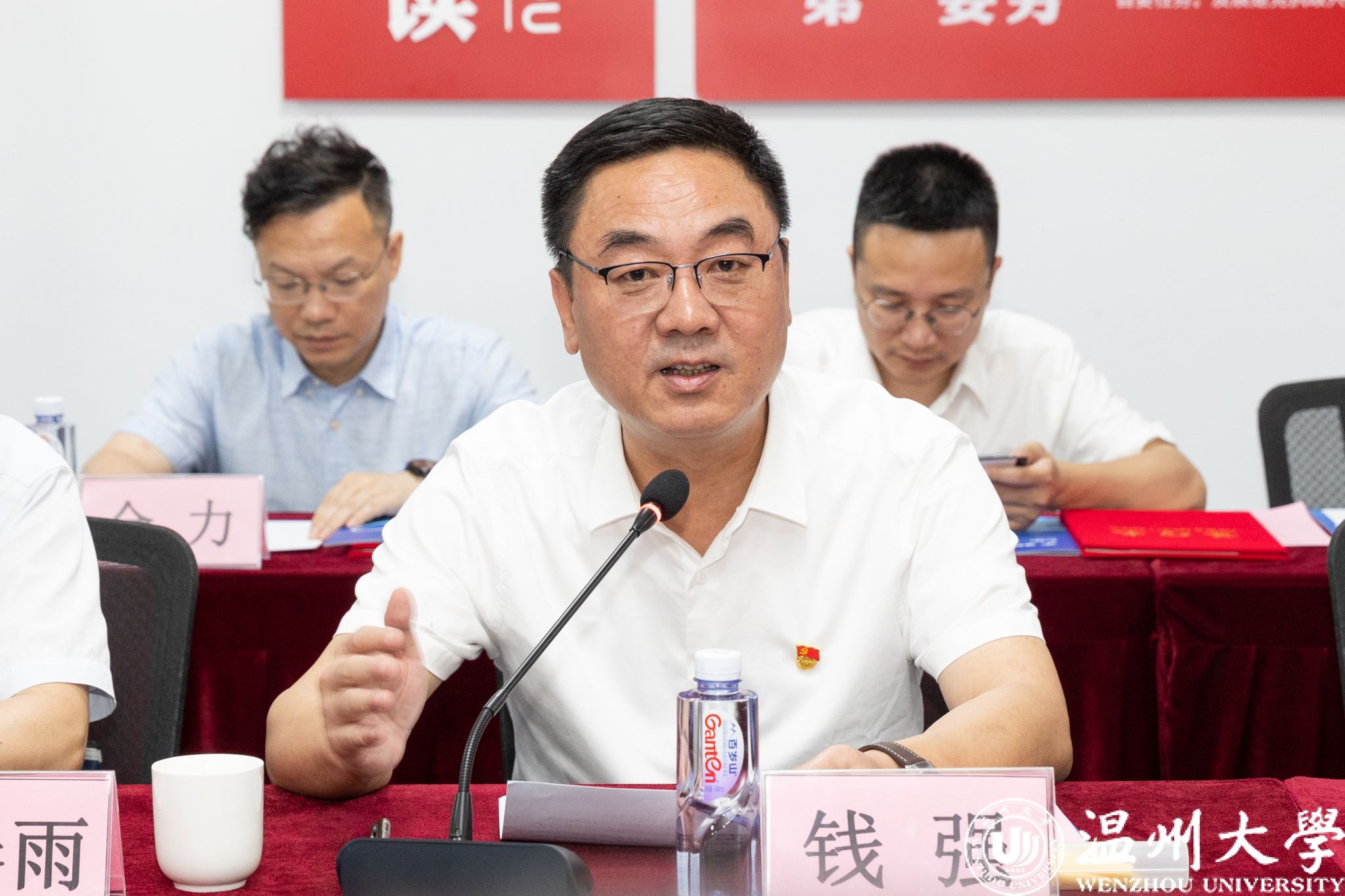 钱强与陈晓为产教融合党建联盟揭牌。温州宏丰党支部书记、亚洲无码 商学院党委书记、数理学院党委书记、化学与材料工程学院副院长、机电工程学院党委书记、电气电子学院党委书记、计算机与人工智能学院党委书记共同签约。产教融合党建联盟成员单位代表发言。