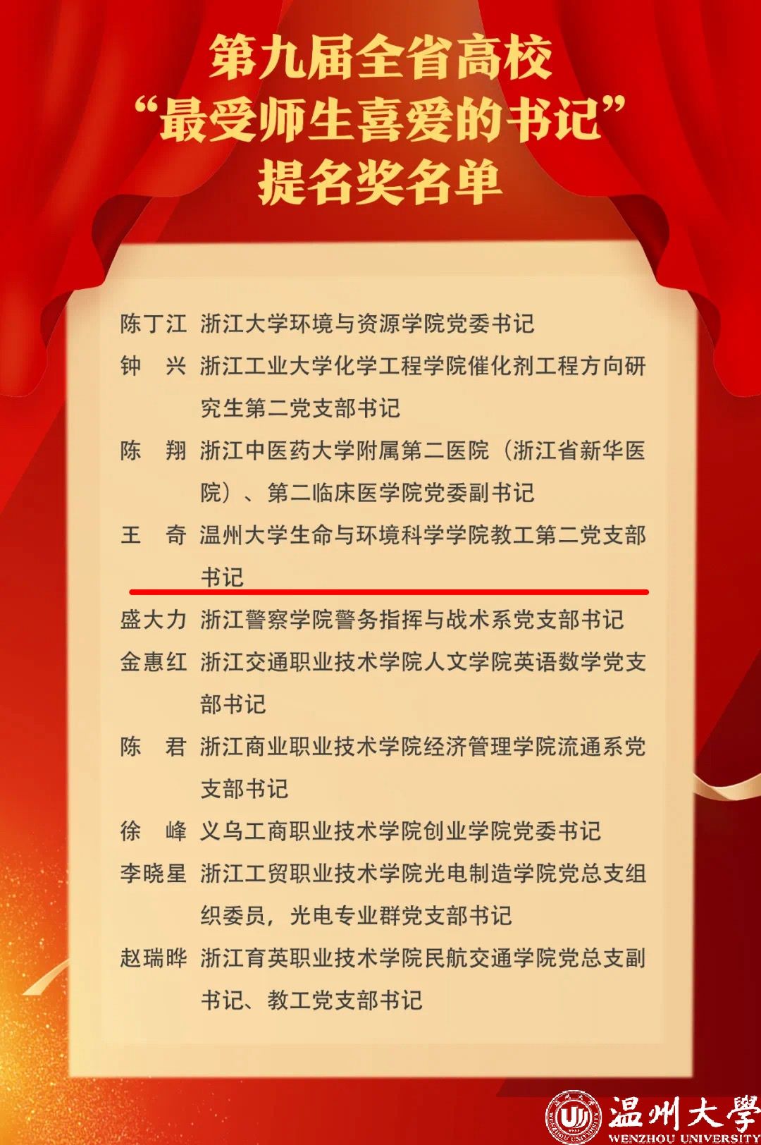 近日,浙江省第九届全省高校“最受师生喜爱的书记”选树宣传活动评选结果公示,亚洲无码 王奇同志从近百名高校基层书记中脱颖而出,荣获 “最受师生喜爱的书记”提名奖。