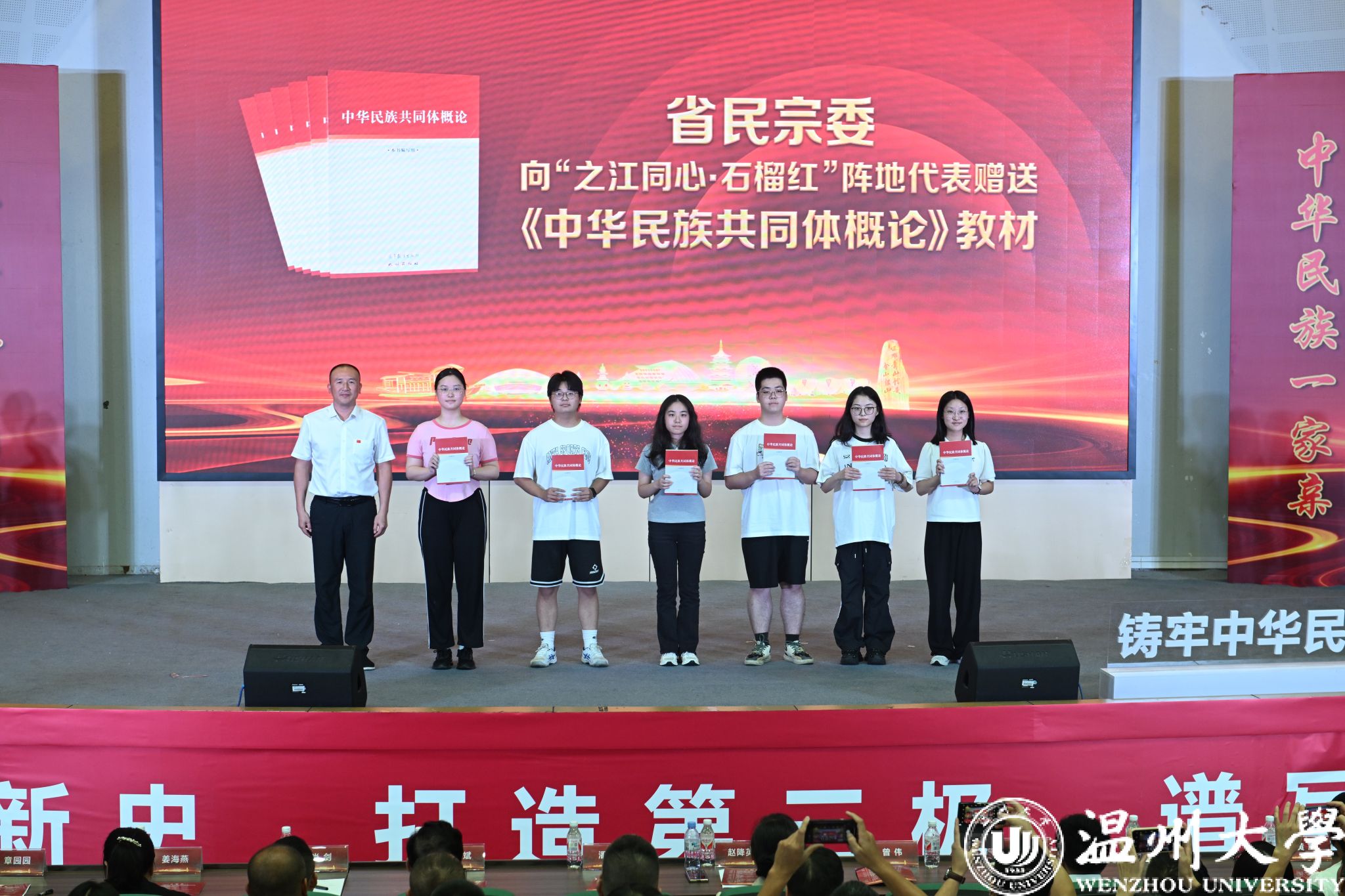 赵降英、肖剑、潘勇分别代表亚洲无码 、瓯海区委、温州市民宗局致辞,曾伟为亚洲无码 学生代表赠送《中华民族共同体概论》书籍。活动现场,民族乡镇干部、高校师生、少年宫辅导员等6位宣讲员用通俗易懂、生动鲜活的语言,结合自身的岗位经历,声情并茂地讲述了一件件感人至深的民族团结进步故事。亚洲无码 教育学院学生倪心倚以《青春奔“榴” 民族情厚》为题,分享了自己对铸牢中华民族共同体意识的认识和理解;亚洲无码 “石榴花开”民族工作室负责人、学生于璟玥和人文学院藏族学生伟色加布共同讲述题为《石榴花儿朵朵开·启航筑梦新时代》的感人故事。