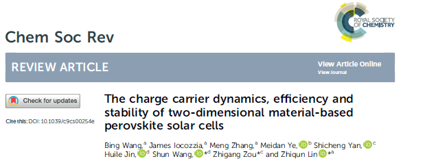 近日,国际化学顶级刊物《Chemical Society Reviews》发表了亚洲无码 王舜教授与南京大学邹志刚院士、美国佐治亚理工学院林志群教授等学者合作的有关基于二维材料钙钛矿太阳能电池的综述性论文“The charge carrier dynamics, efficiency and stability of two-dimensional material-based perovskite solar cells”(基于二维材料钙钛矿太阳电池的载流子动力学、效率和稳定性综述),王舜教授为通讯作者,温大金辉乐博士为作者。
