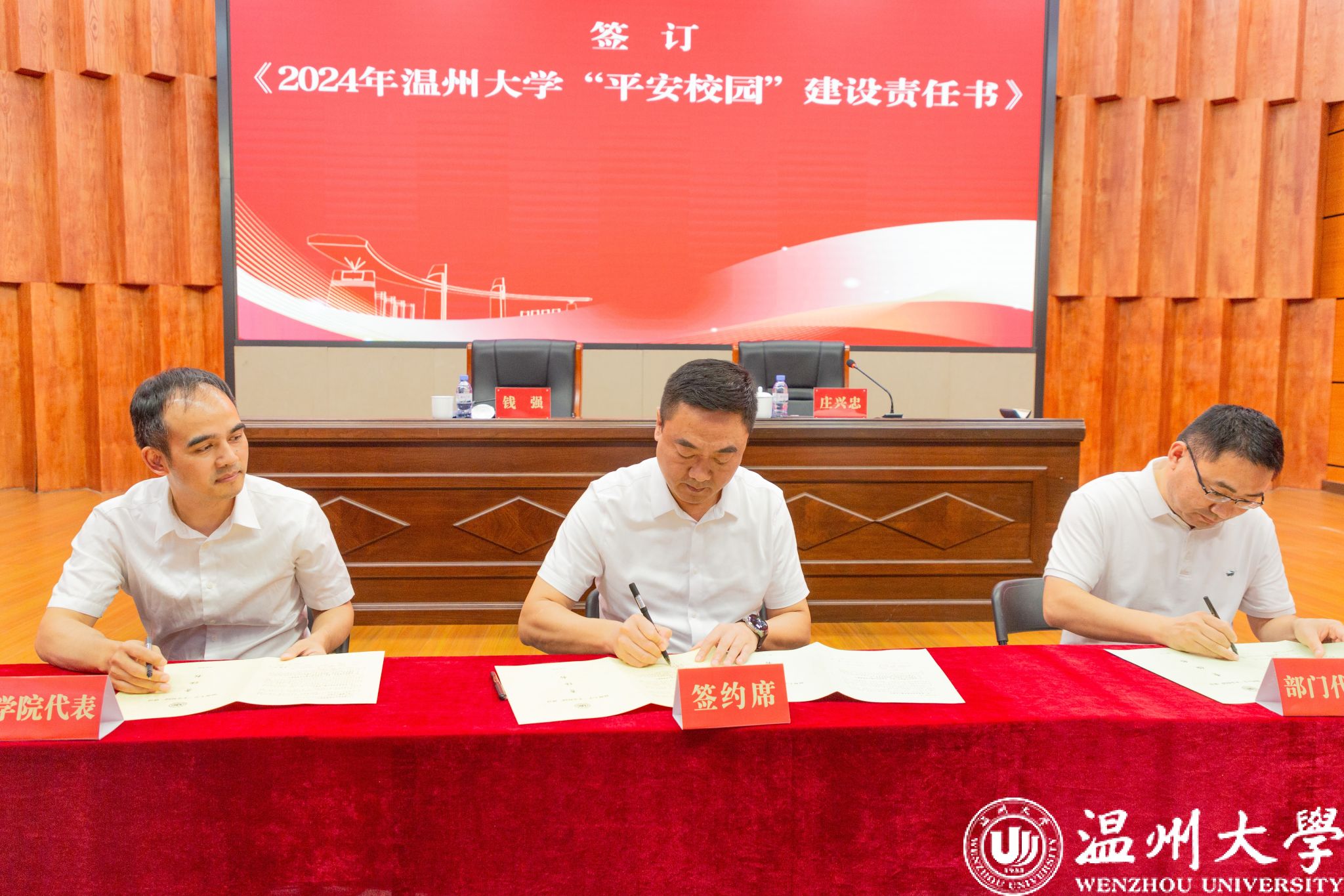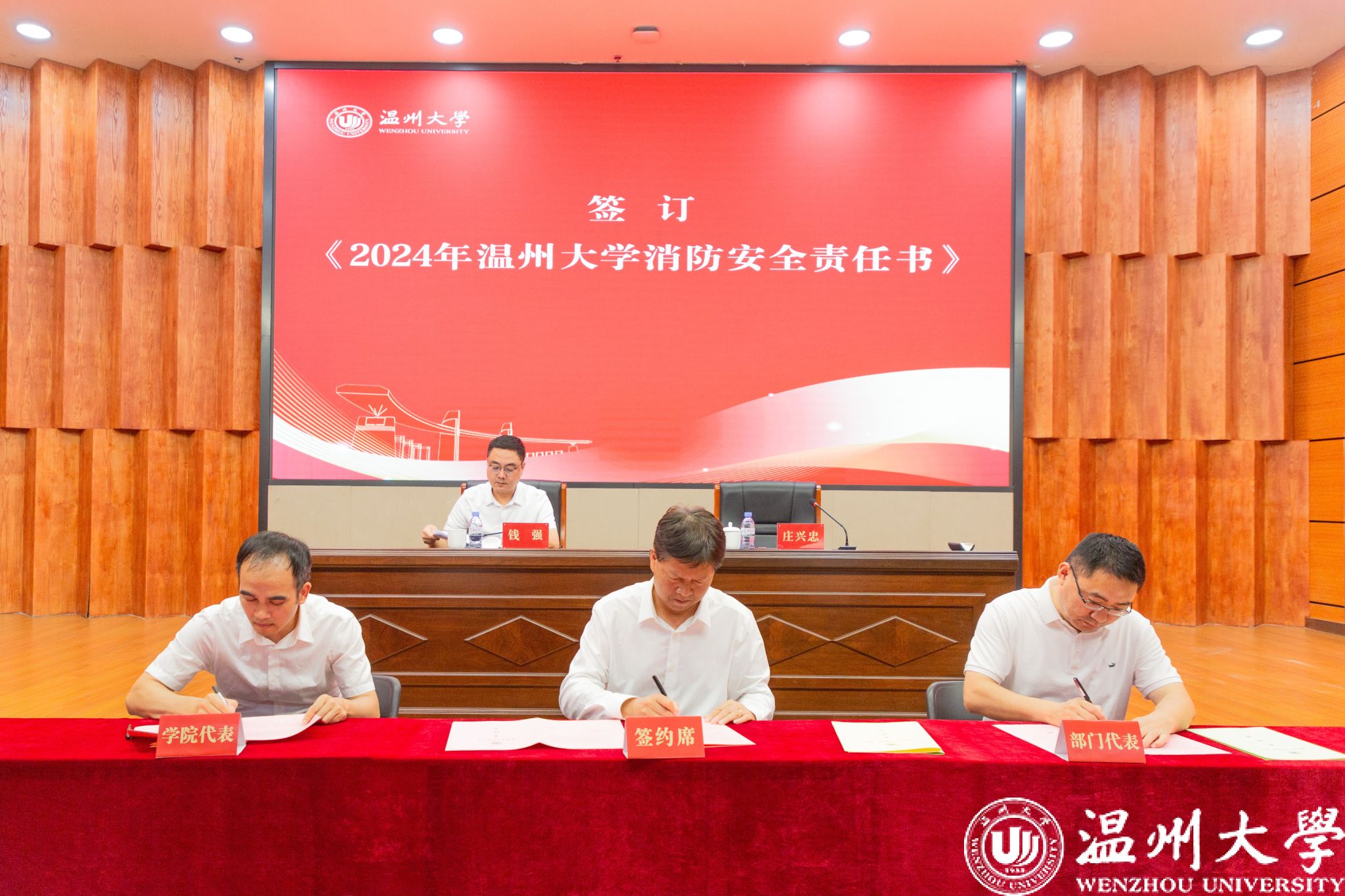 接着,大会举行了责任书签订仪式。钱强与庄兴忠代表学校与学院及部门代表分别签订了《2024年亚洲无码 “平安校园”建设责任书》与《2024年亚洲无码 消防安全责任书》。庄兴忠要求各学院、各部门在会后迅速行动,层层签订责任书,确保责任到人,形成齐抓共管的良好局面。