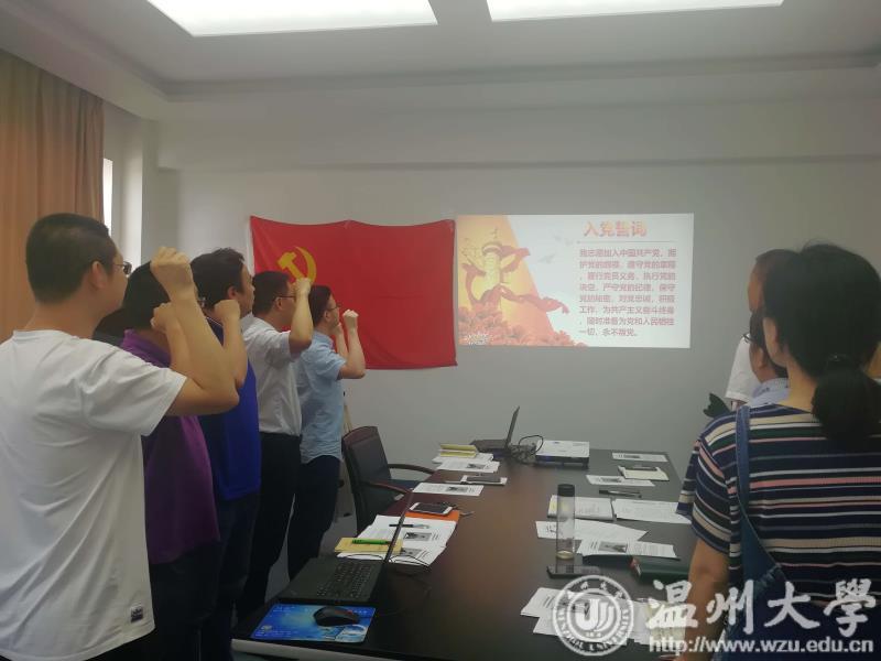 机电工程学院理论中心组开展“不忘初心、牢记使命”主题学习会,会上,全体领导、党支部书记重温入党誓词。