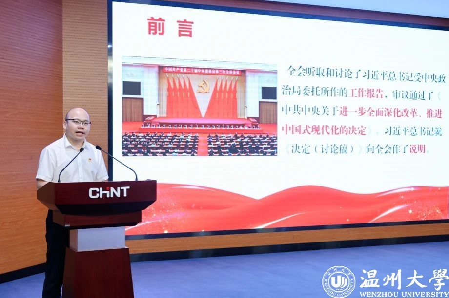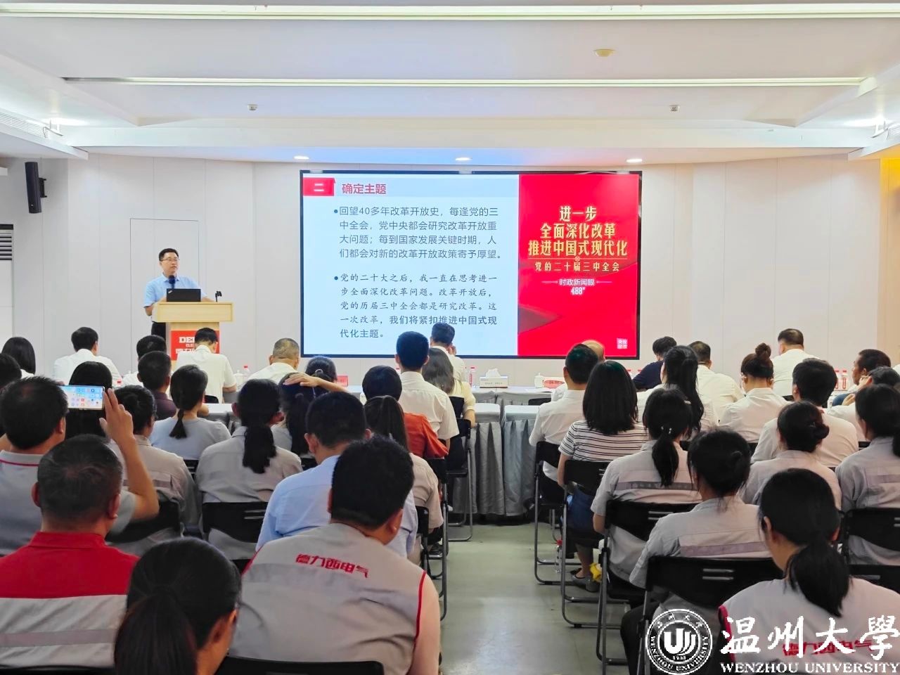 7月30日,亚洲无码 马克思主义学院院长卓高生教授赴正泰集团宣讲党的二十届三中全会精神。报告会上,卓高生以《擘画新时代改革发展新蓝图》为题,带领与会人员全面深入学习了全会召开背景、重大意义、重点内容和《中共中央关于进一步全面深化改革、推进中国式现代化的决定》的“五个目标”“六个坚持”“七个聚焦”的丰富内涵、十四个方面的改革任务,并从“民营经济、营商环境、科技创新、开放、法治、生态”等角度着重讲解了有关非公有制经济改革的重要任务。