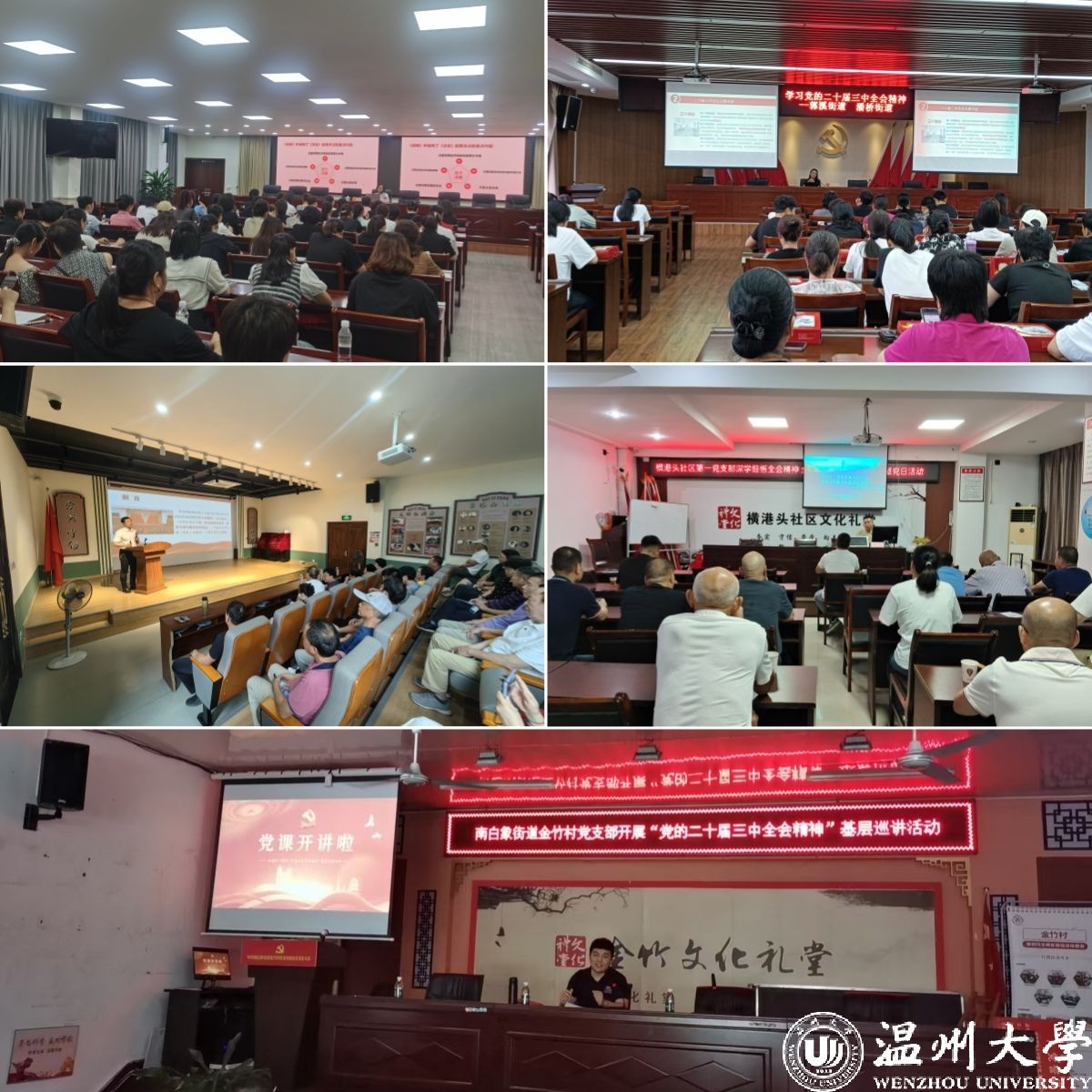 8月1日、8月16日、8月24日、9月14日、9月20日,亚洲无码 马克思主义学院关震博士分别赴郭溪街道基层党校,南白象街道南垟社区霞坊社区、横港头社区,丽岙街道,五马街道百里坊社区等地宣讲党的二十届三中全会精神。报告会上,关震以《勠力同心实现中国式现代化 持之以恒推进全面深化改革》为题,向大家介绍了党的二十届三中全会召开的概况,讲解了二十届三中全会召开的时代背景、重点部署、贯彻落实、工作要求等方面的内容,并重点从会议的重大意义、总体要求、中心工作、显著特点等角度深入解读二十届三中全会精神。