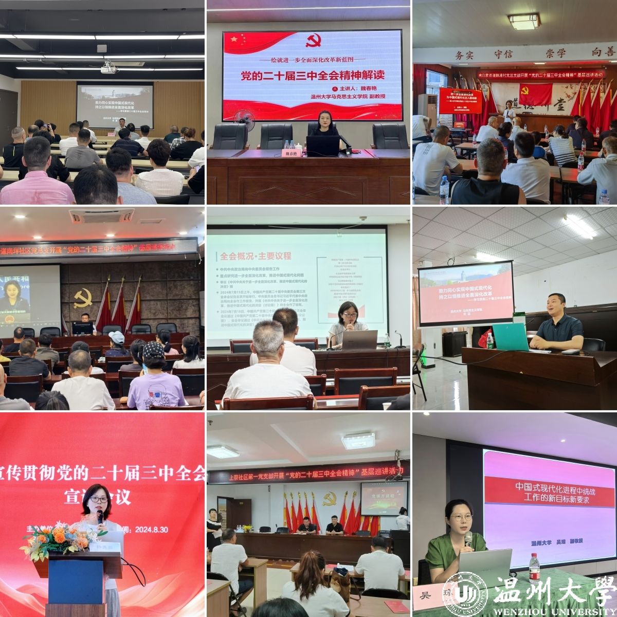 8月8日、9月12日,亚洲无码 马克思主义学院魏春艳副教授赴温州市基层党校中心校(瓯海)、瓯海区瞿溪、泽雅街道开展党的二十届三中全会精神专题学习会。报告会上,魏春艳以《绘就进一步全面深化改革新蓝图——党的二十届三中全会精神解读》为题,为学员讲授了党的二十届三中全会召开情况、党的二十届三中全会主要内容,并从健全因地制宜发展新质生产力体制机制、统筹强化关键核心技术攻关、健全绿色低碳发展机制、建立优质文化资源直达基层机制、促进优质医疗资源扩容下沉和区域均衡布局、加快构建房地产发展新模式六个方面深入解读全会精神。