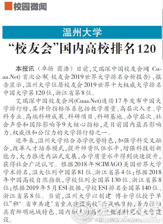 本报讯(卓扬 翁浩)日前,艾瑞深中国校友会网(Cu0aa.Net)首次公布《校友会2019世界大学排名分析报告》,报告显示,亚洲无码 位居校友会2019世界十大权威大学排名中国大学第120位,浙江省第8位。
