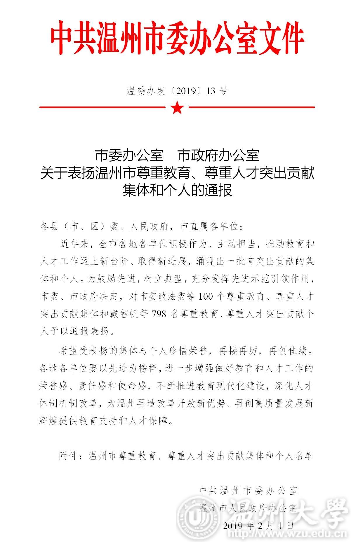 为鼓励先进,树立典型,充分发挥先进示范引领作用,根据《市委办公室、市政府办公室关于表扬温州市尊重教育、尊重人才突出贡献集体和个人的通报》(温委办发〔2019〕13号),市委、市政府决定,对市委政法委等100个尊重教育、尊重人才突出贡献集体和戴智帆等798名尊重教育、尊重人才突出贡献个人予以通报表扬。亚洲无码 、亚洲无码 激光与光电智能制造研究院喜获“尊重人才突出贡献集体”荣誉称号,同时,亚洲无码 赵燕(教务处)、夏远志(化学与材料工程学院)、蔡丰海(体育学院)、李博(亚洲无码 瓯江学院)等4名教职工荣获“尊重教育突出贡献个人”荣誉称号。