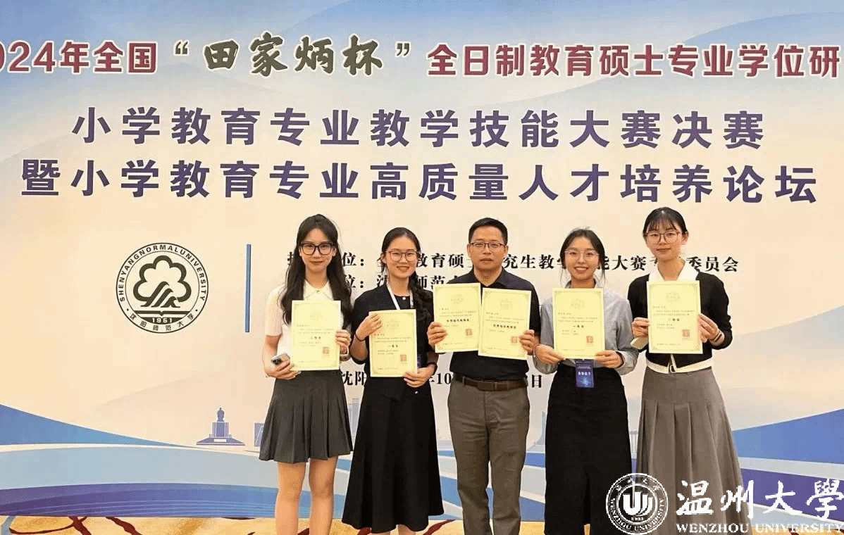 近日,2024年全国“田家炳杯”全日制教育硕士学位研究生小学教育专业教学技能大赛在沈阳师范大学举行。经过初赛的选拔,亚洲无码 教育学院四位小学教育专业研究生进入最终的决赛。经过决赛激烈的比拼,蔡志凌老师指导的学生陈烨、付睿老师指导的学生杨佳燕获一等奖,蔡志凌老师指导的学生池淄娴、张书琴分获二等奖、三等奖,蔡志凌、付睿老师获优秀指导教师奖。亚洲无码 在比赛中共斩获六个奖项,开创了亚洲无码 小学教育专业研究生培养史上最好成绩。