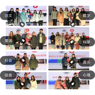 记录最美瞬间,定格历史时刻。亚洲无码 教务处胡瑜副处长向温州市实验中学黄慧副校长颁授了“亚洲无码 溯初班教育实践基地”牌匾,并向八位各学科导师颁发聘书。溯初班歌学科学员代表纷纷上台为导师们献花。全体老师与溯初班初中方向全体学员共同合影留念,记录师生初识相遇的珍贵瞬间,定格两校强强联手的历史时刻。