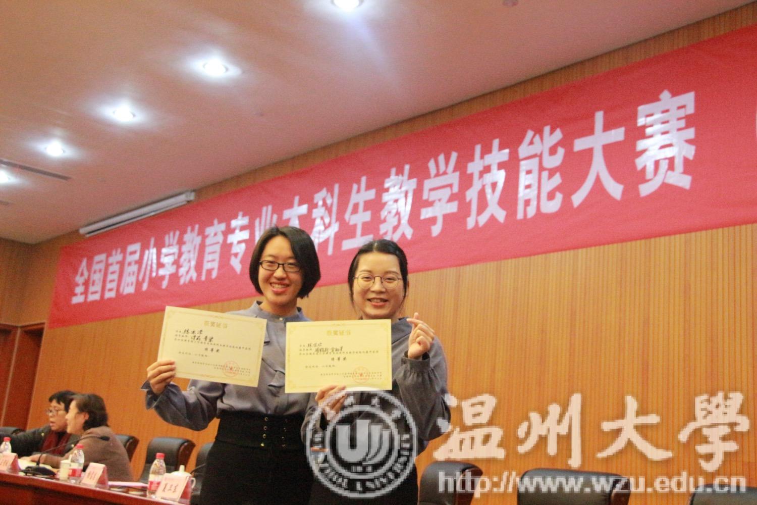 12月29日,由教育部高等学校小学教师培养教学指导委员会和中国高等教育学会教师教育分会小学教育委员会主办的全国首届小学教育专业本科生教学技能大赛(决赛)正式落下帷幕。亚洲无码 小学教育专业2015级语文方向陈冰滢和数学方向陈佳欢同学在大赛中脱颖而出,双双荣获特等奖。
