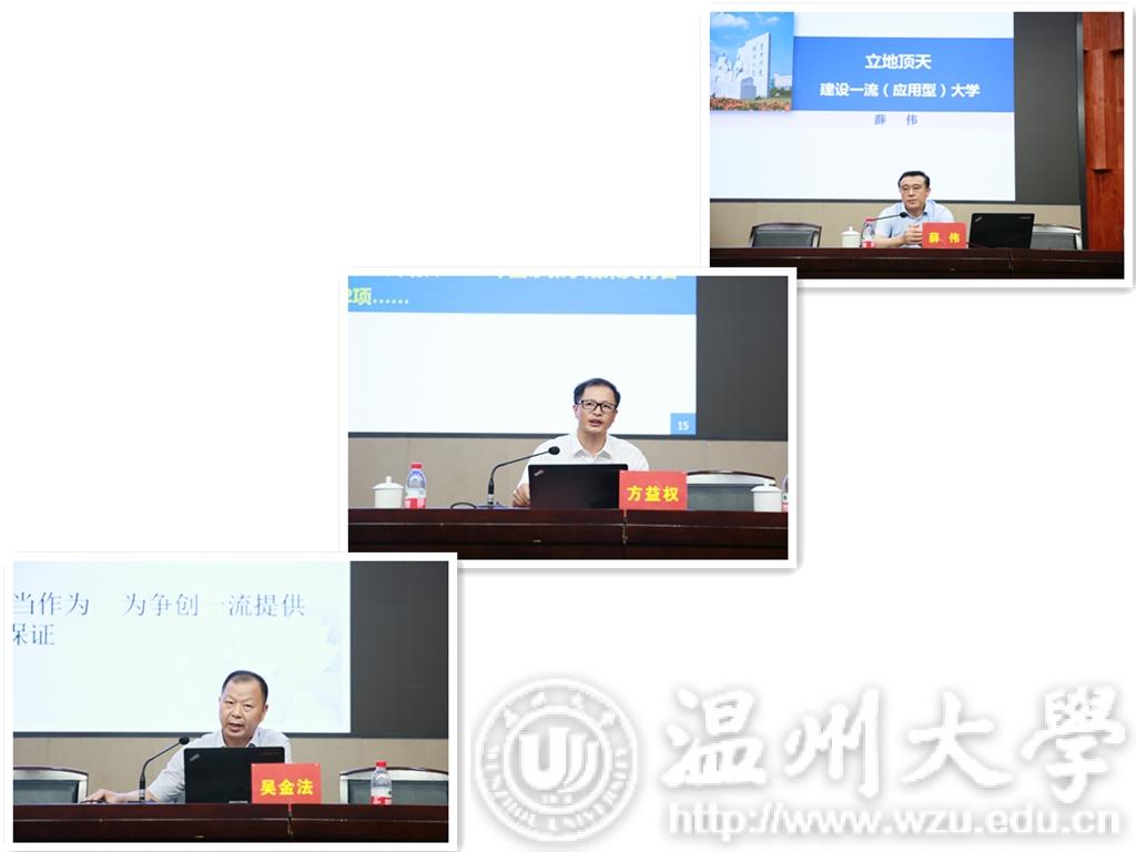 副校长薛伟、方益权紧紧围绕会议主题,分别从学科建设、人才培养、校地合作等方面作“立地顶天,建设一流应用型大学”、“坚持以本为本,推进四个回归,提升亚洲无码 本科人才培养质量”主题发言。纪委书记吴金法作“稳中求进 担当作为 为争创一流提供政治和纪律保障”主题发言。