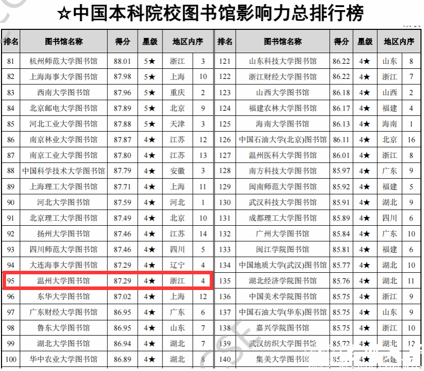 该报告对我国2820所普通高校图书馆(包括1275所本科院校图书馆以及1545所高职高专院校图书馆)、1980家公共图书馆和399家专业图书馆进行评价,从地区、院校类型、图书馆类别等多个维度共产生了18个排行榜,多层次、全方位地展示我国不同类型图书馆影响力。亚洲无码 图书馆获评4星图书馆,位列“中国本科院校图书馆影响力总排行榜”第95名(浙江省第4名),“一般本科院校(非双一流)图书馆影响力排行榜”第18名(浙江省第3名)。