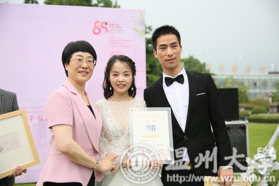 校党委书记林娟娟为12对校友送上温大版的结婚证书,在母校,新人们许下“爱在温大”的誓言。最可亲的恩师分别为新人送上了学校特意准备的礼物——“爱之吻”发绣。
