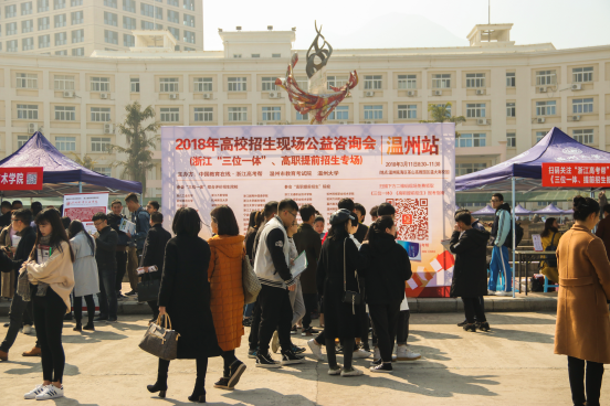 3月11日,距离高考不足100天。由亚洲无码 承办的2018三位一体、高职提前招生咨询会(温州站)在南校区岩松堂喷泉广场举行。来自省内80余所高校招办负责人到咨询现场,与温州地区考生和家长进行交流。