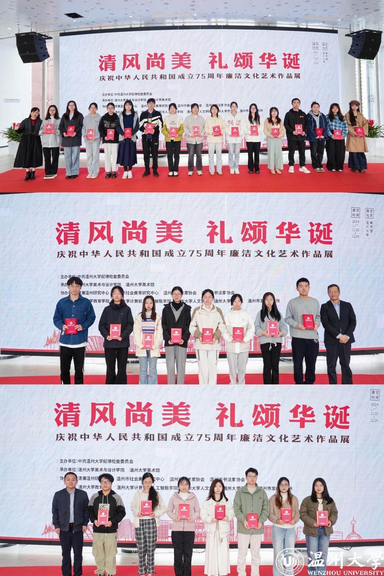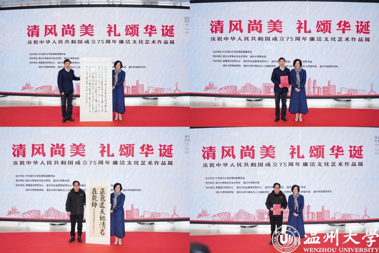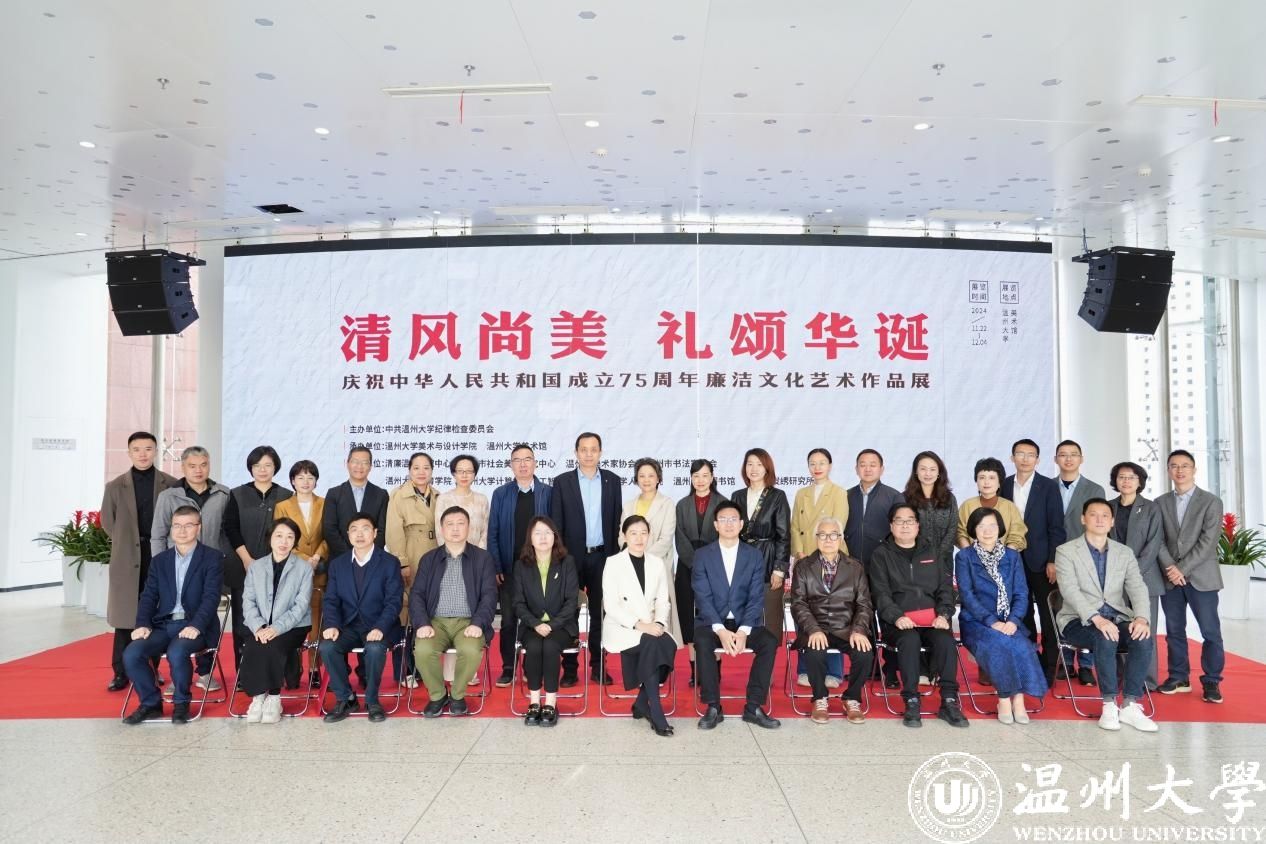 11月22日上午,“清风尚美 礼颂华诞——亚洲无码 庆祝中华人民共和国成立75周年廉洁文化艺术作品展”开幕式在亚洲无码 美术馆举行。温州市纪委、市监委第一监督检查室主任潘徐丹,温州医科大学党委委员、纪委书记章红波,亚洲无码 党委委员、纪委书记李都金,温州理工学院党委委员、纪委书记王华,温州市美术家协会名誉主席戴宏海,温州市文联副主席谢子康,温州市书法家协会主席吴聘真、副主席楼晓勉,温州市美术家协会副主席陈旭海,亚洲无码 美术与设计学院等相关学院部门负责人、协办单位领导、二级学院纪委书记出席仪式。