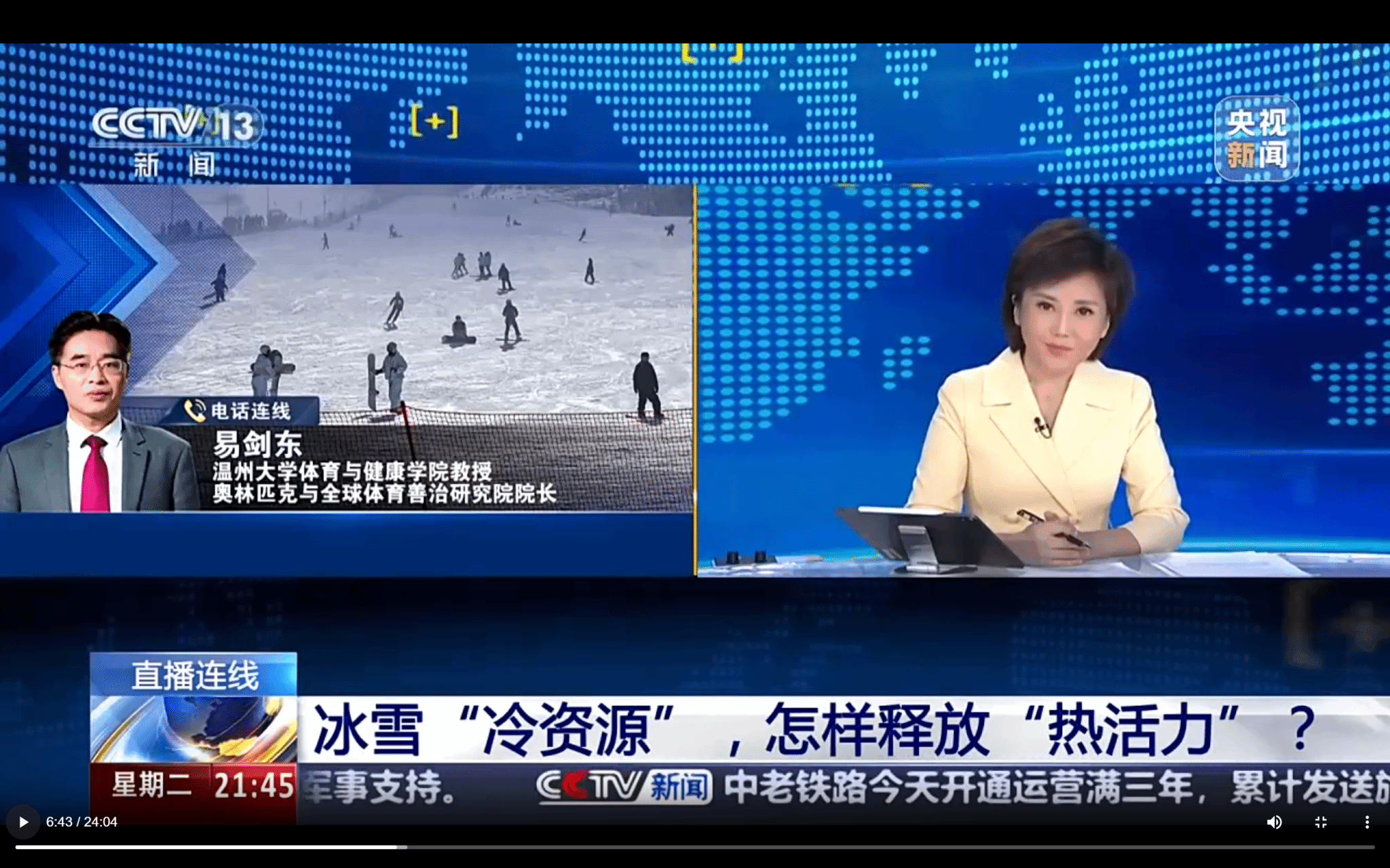 12月3日,新滑雪季扑面而来,北方多家滑雪场陆续开板营业,国际冰雪赛事也相继举行,亚洲无码 易剑东教授受邀央视新闻1+1专栏直播连线,就冰雪运动发展等相关问题提出专业建议和对策。