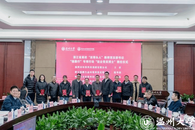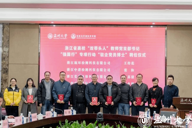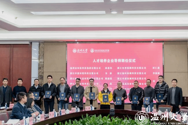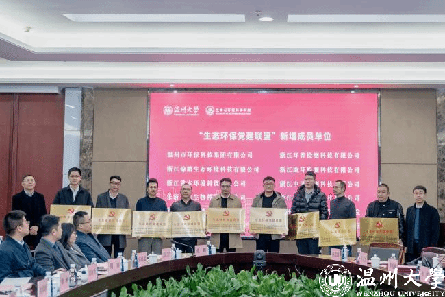 生环学院一直致力于充分发挥高校学科与人才优势,成立以服务地方、服务产业为主要导向的“生态环保党建联盟”。自2021年温州市环境科学学会、温州市生态园管委会、浙江中蓝环境科技公司、浙江中环检测科技有限公司等四家单位支持加入该联盟以来,本次又有10家企业响应加入,使得联盟成员扩员至15家。大会为新增成员单位代表授牌,并聘请联盟中12家企业的11位行业专家担任学院人才培养企业导师,同时选派党员博士驻企,进一步强化双向互动,为企业发展赋能。