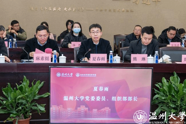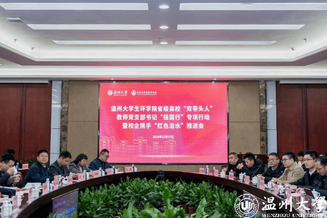 为进一步发挥教师党支部示范作用,深化校企合作联学共建,将“红色力量”转化为高质量发展的“绿色引擎”,12月27日下午,亚洲无码 生环学院省级“双带头人”教师党支部书记“强国行”专项行动暨校企携手“红色治水”推进会在南校区岩松堂白鹿厅举行。亚洲无码 党委委员、组织部部长夏春雨,温州市生态环境局副局长麻素挺,温州市环境科学学会秘书长任一力,合作企业代表,校科技处、地方合作处等职能部门负责人,生环学院领导班子及师生党员代表出席大会。
