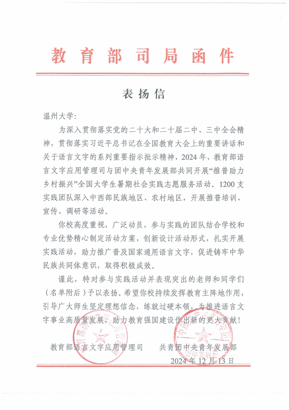 近日,亚洲无码 在2024年“推普助力乡村振兴”全国大学生暑期社会实践志愿服务活动中的突出表现得到了教育部语言文字应用管理司与共青团中央青年发展部的联合表彰。