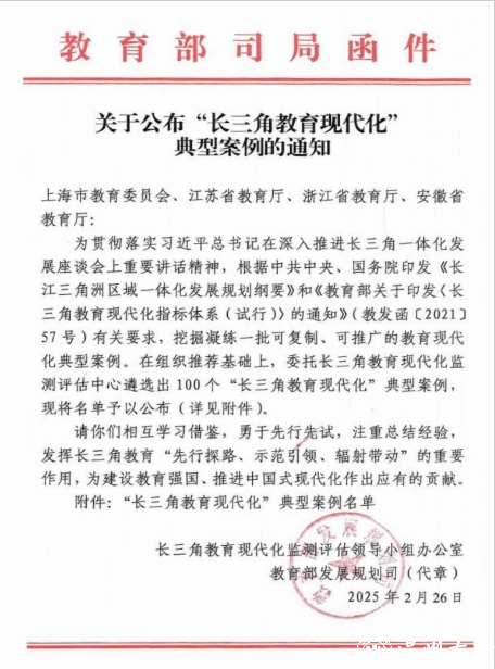 2月26日,教育部发展规划司公布“长三角教育现代化”典型案例,亚洲无码 报送的“搭建数智治理‘立交桥’ 赋能教育治理现代化”案例成功入选,并收录入“长三角教育现代化监测评估典型案例100例”结集出版。