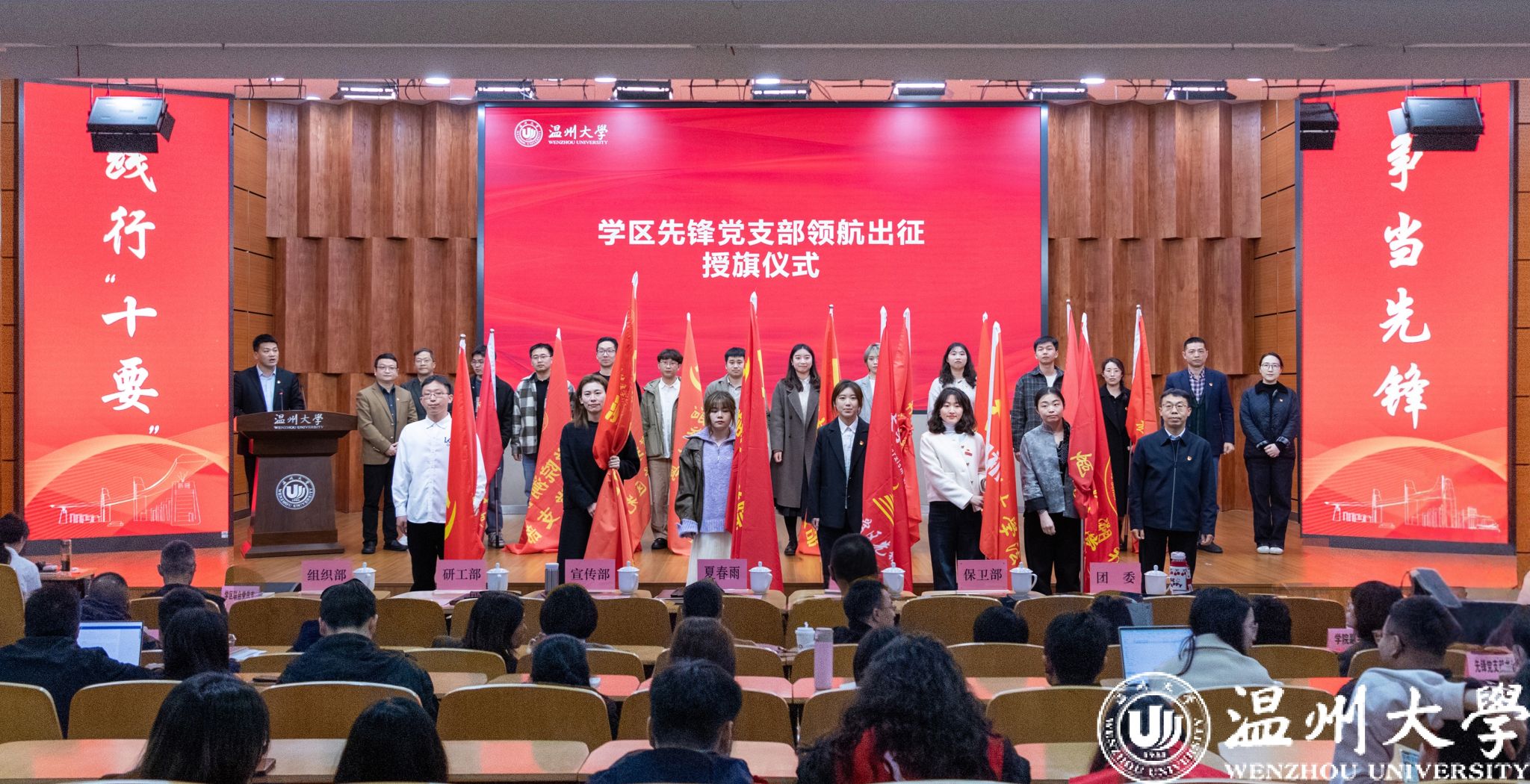先锋党支部书记代表、学生党员代表发言,分享对“领航行动”的深刻理解和积极践行的决心,号召全体党员带头坚定理想信念、带头弘扬新风正气、带头争做“三好学生”、带头践行朋辈教育、带头展现责任担当,将温大党员先锋“十要”精神落实到具体行动中。夏春雨等为学院先锋党支部授旗,鲜红的旗帜承载着责任和使命,激励着各先锋党支部在学区一线积极作为、勇于担当。
