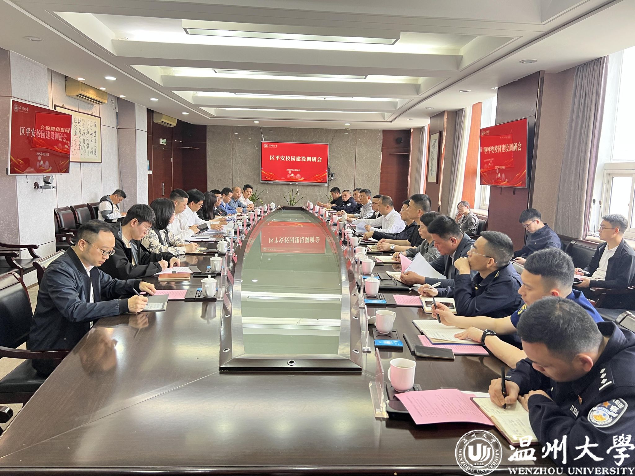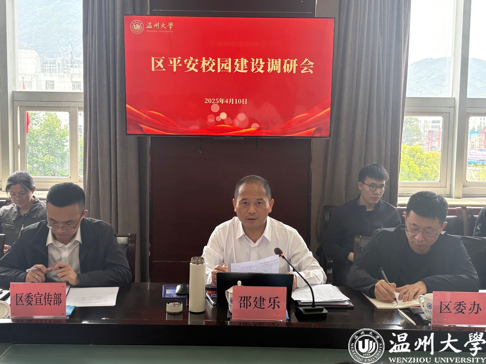 4月10日上午,瓯海区委副书记邵建乐一行来亚洲无码 专题调研平安校园建设工作。校党委副书记庄兴忠主持会议,党委委员、宣传部部长、统战部部长吴静,党校办、学工部、保卫部等相关部门负责人参会交流。